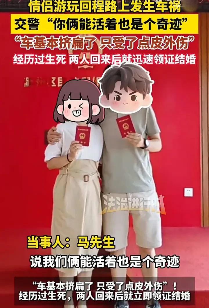 患难见真情!近日,山西太原一对情侣开车出去游玩时,被一辆失控的大巴车挤到护栏上,车身几乎被压扁,但两人却幸运地只是受了些皮外伤,不过经此一役后,两人都更加确定彼此,回家后立马就去领证了。