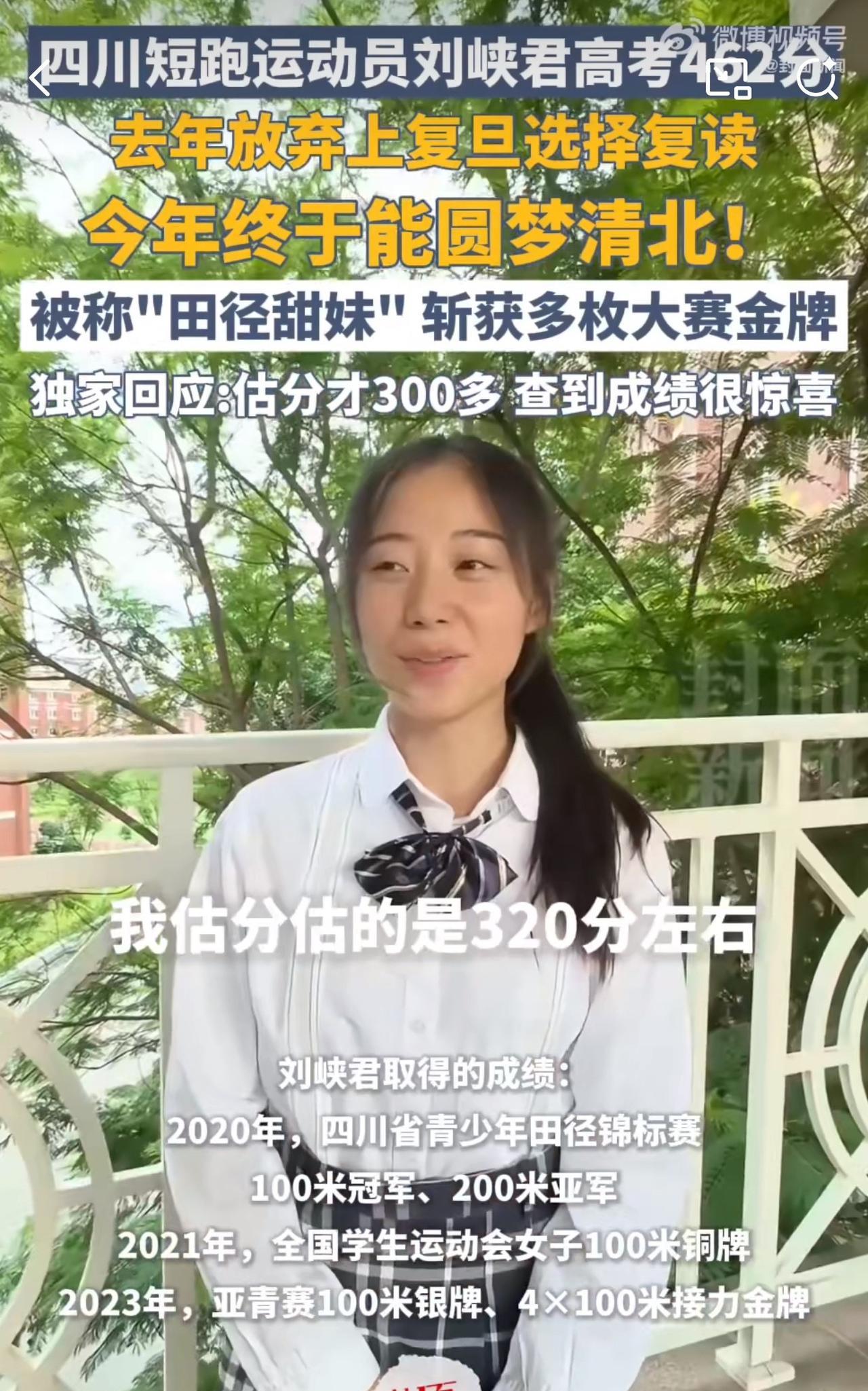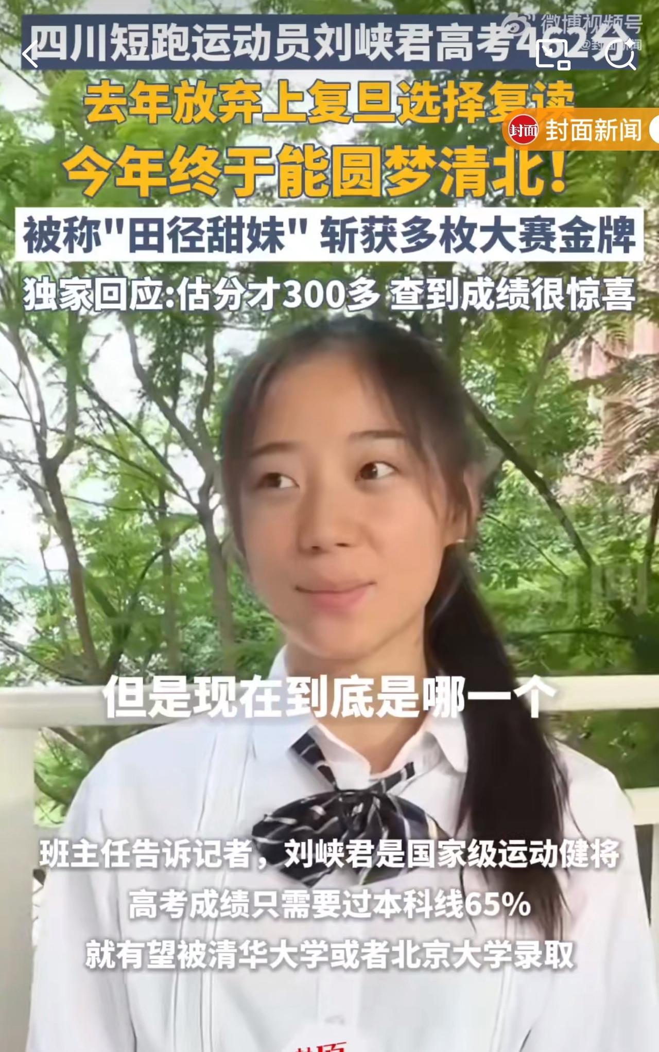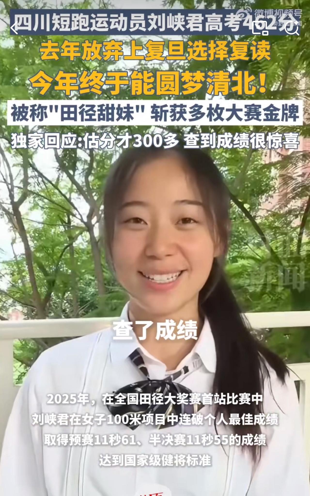 #MCN双量进阶计划#“放弃复旦成功圆梦北大!”据媒体报道,国家级运动员刘峡君已经收到北京大学录取通知书,将就读新闻与传播学院体育专业,但这几天正在衢州参加全国田径锦标赛。 据悉,刘峡君去年放弃上复旦选择复读,今年以高考462分的成绩圆梦北大。此前高考结束,刘峡君表示估分320分左右,查了成绩,还有点不太相信,460多分是自己考得最好的成绩了!” 看完刘峡君这事儿,周少觉得还是挺让人佩服的。放弃复旦大学复读,最后考了462分上北京大学,听着像“逆袭爽文”,但背后有不少门道。 据悉,北京大学这个新闻与传播学院体育专业,可不是简单的体育生路子。它要的是国家级运动员,体育得拔尖,文化课也得够线。 有意思的是,她这会儿还在衢州比全国田径锦标赛,女子100米半决赛跑了11秒57,成绩不差。一边备战大赛,一边搞定高考,这平衡能力真不一般。 对于刘峡君去年放弃复旦大学,复读一年成功考上北京大学,大家怎么看呢?#长沙新朋友# #寻美三湘#