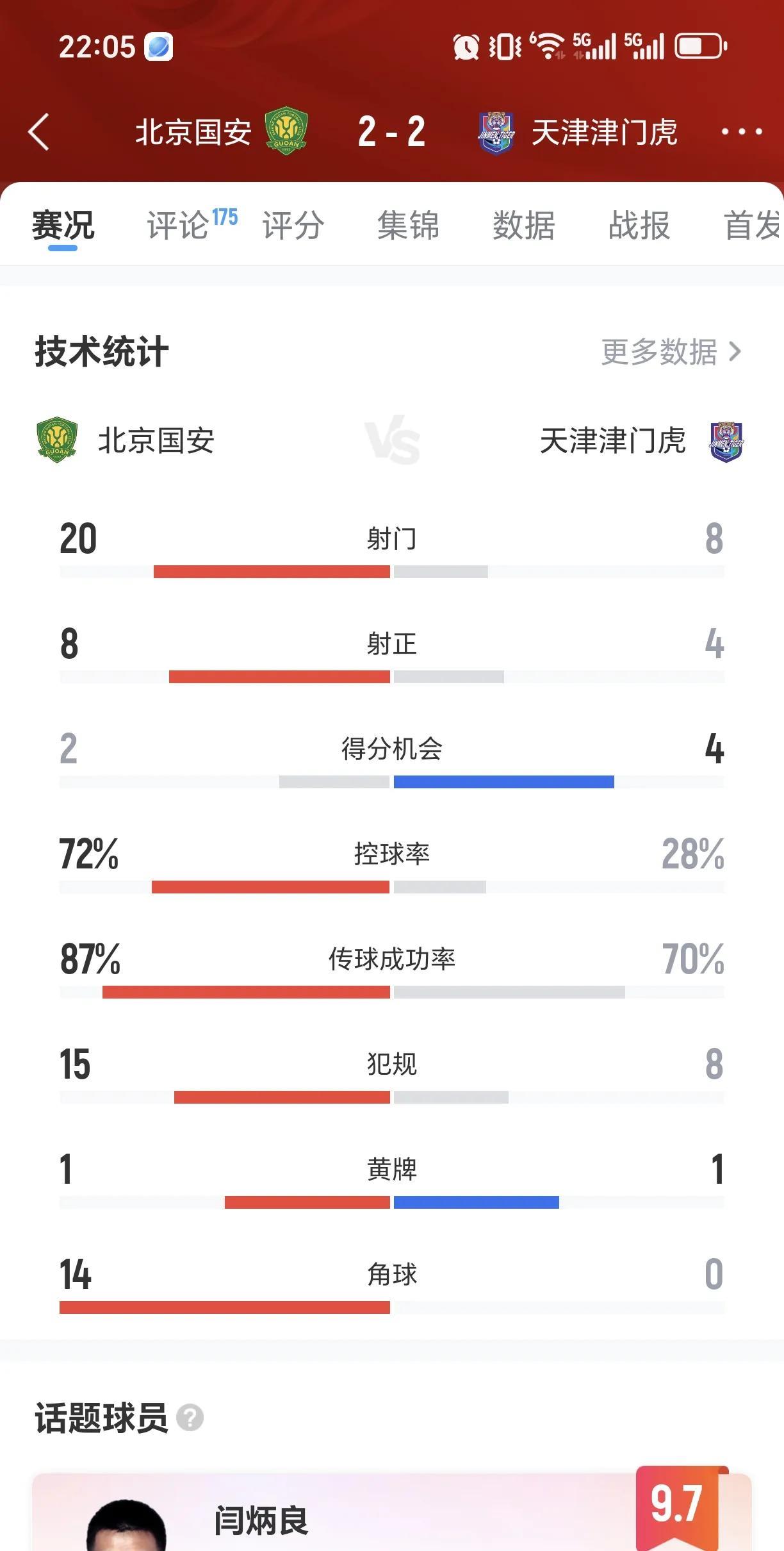 放你两马!国安2:2天津,国安别抱头惋惜自己的平局了。看看这吓人的两个瞬间吧,人家已经脚下留情两次了。如果不服的话,你再看看赛后的统计吧,一分也已经够你的头了[发怒][发怒] 国安在自己的主场,终于拿到了最近三轮里的第一个积分。国安为了拿下这个三分,真的是把天津按在地上按摩了120分钟。而整场72%的控球率,也正是国安决心的证明。尽管这样,但是最后的一分也够对得起国安了,甚至国安应该为这个结局感到庆幸才好,为什么? 别看国安打的热闹,全场轰了20次射门。但是天津也有自己的绝招,尤其是比赛最后阶段,大举压上的国安遭遇了两次被绝杀的瞬间。 第一个瞬间,那就是国安还在投诉禁区里的犯规动作,天津的反击就来了。王秋明非常鸡贼的跑位,获得了一个大单刀的机会。只可惜冲刺了好几十米的他,最后的单刀打的软绵无力,被门将没收了。像这样的好机会,国安有过几次呢?当然哪怕比赛最后时刻,天津依然有机会一剑封喉。 第二个瞬间,那还是基赖斯差点帽子戏法。如果这样的机会放在上半场的话,基本上是必进无疑。最后的打门质量下降,依然还是最后的体能原因。而反观国安呢,这个非常想赢的球队,他们的表现呢? 哪怕在最后时刻,他们依然在追随着自己的信仰,那就是无效的控球率。但是对对方的实质性威胁几乎没有,而赛后的数据统计更是刺眼。 国安的进攻数据几乎压倒性的领先,天津全场更是一个角球没有。但是人家却创造了四次得分机会,而国安仅仅创造了两次。面对这样的局面,真的是心疼国安的球迷。 塞蒂恩再不改变真的没有什么出路了,下一场对阵浙江依然是个反击高手。难道又是国安赢得了场面,没有赢得三分的结局嘛?如果是这样的话,那么每场一分好像也够国安的头了!#头号创作者激励计划#
