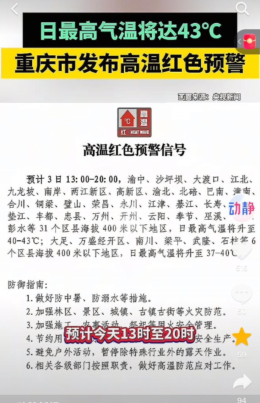 有点吓人!重庆发布高温预警,最高气温达43度,看来我们这35度与重庆比起来小菜一