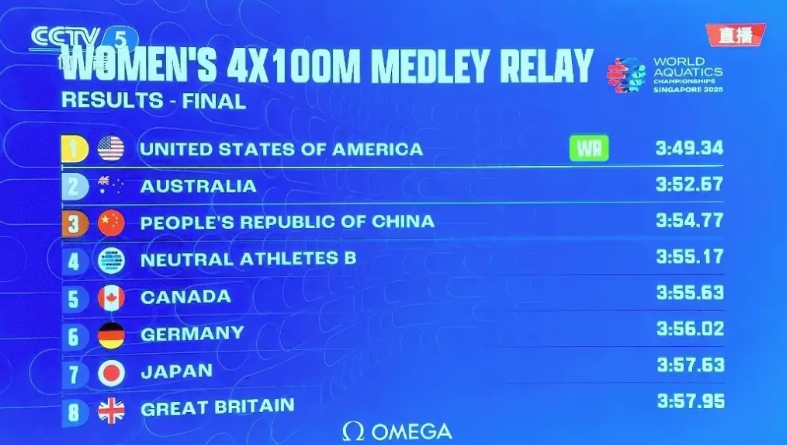 本届世锦赛的收官之战,女子4×100米混合泳决赛,中国队第6道出场,他们是彭旭玮