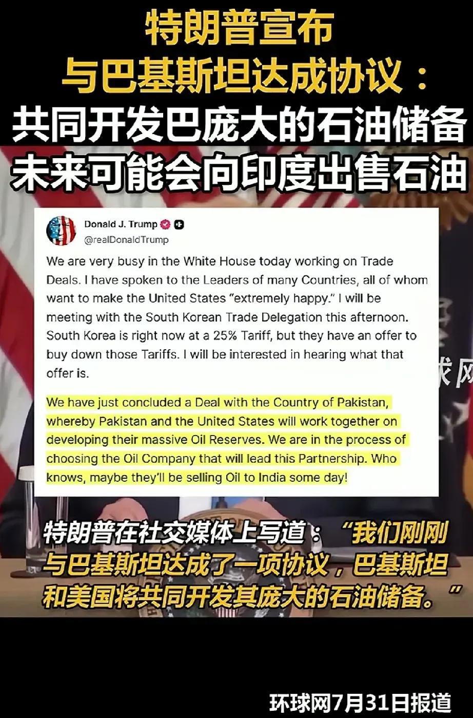 川普宣布:美国与巴基斯坦已达成协议共同开发巴基斯坦庞大的油气资源,未来可能向印度出售石油。 巴基斯坦已探明的石油达2270亿桶,超过沙特,居世界第四。 网友们不淡定了,巴基斯坦与中国不是很铁吗?为什么中国没有加入开发呢? 美国人也太厉害了,一方面和印度搞什么印太战略,一方面又与巴基斯坦挺好的,但5.7空战中,美国又不准巴基斯坦使用F16战机对付印度阿三,让巴基斯坦使用中国装备打败了印度阿三,,,,,, 今天,美国反过来又与巴基斯坦大合作开发大油田,真的看不清楚了! 巴基斯坦媒体又说:将从中国购买歼35,空警500,红旗19等超级装备,哈哈哈 中国还有这个必要吗?让巴基斯坦去买F35好了。 美国人吃两头,吃惯了,太厉害了。 那么印度阿三肯定与美国不友好了,中国应抓住机遇与印度解决边界问题,且进一步扩大中印合作了 这个复杂的世界里,有些事,真的不是凡人所能理解的!