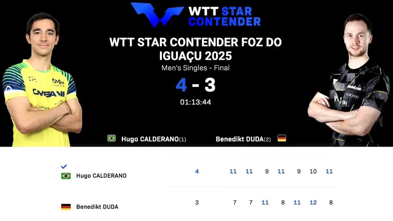 WTT球星挑战赛伊瓜苏站男单比赛结束,雨果战胜杜达夺得男单冠军,1000分收入囊