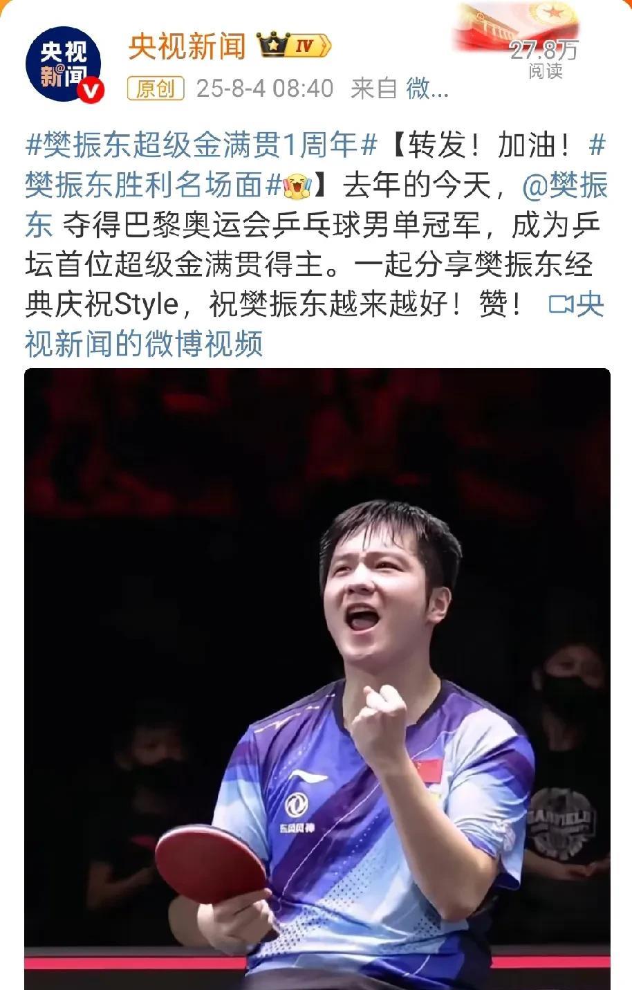 央媒今天纷纷发文,纪念樊振东奥运夺金一周年,重温小胖超燃夺冠之路。 去年今日樊振