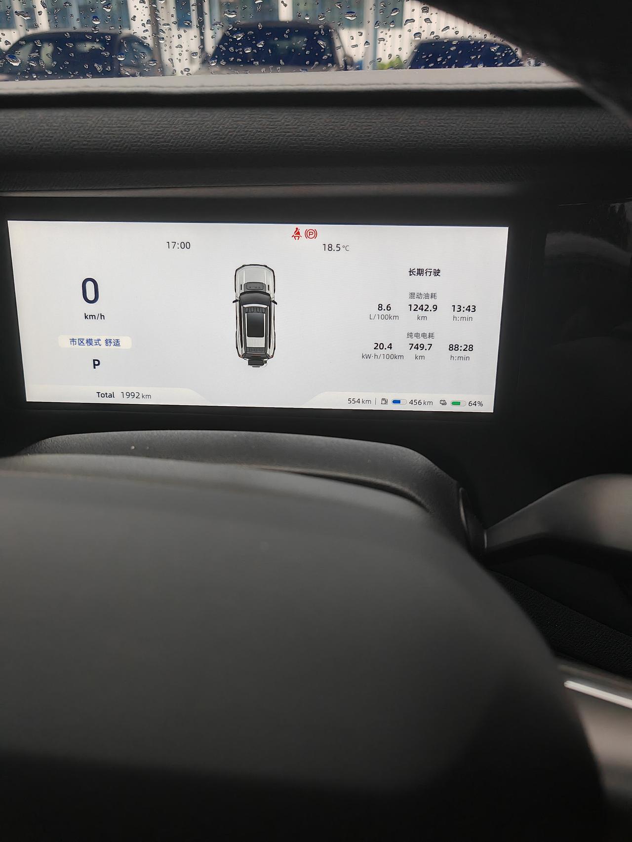 有将近1400km是在高速上好的 先说一下用车感受吧 那天我来广东 正好碰到珠海台风 前面几个城市还好 没有下多大雨 等接近广东的时候 那真的是顶着狂风暴雨 但是我又很急 因为我的行程安排的太紧了 所以一直顶着一百二一百三跑 走在高速上的时候这辆车给我很足的信心 因为很大的风 但是车身并没有过多的晃动 而且走在积水路面 也没有出现打滑的迹象 就是油耗太高了 都开到 8.6 -8.9 了 我开的是山地模式 电量保持70% 驾驶模式舒适 因为这样动力充足还能保住电 但是这个油耗我完全能接 因为碰到这么恶劣的天气 那么大的风和雨 这个油耗对比其他方盒子车真的算很低了 在高速上我还试了一下那个智能巡航辅助 感觉开起来很省心 但是还有待提高 因为我发现他碰到中间有大车 他就会靠左边的线 这个时候 如果左边的车正好过来超车 他就会给你来急刹车 这一点是很危险的 因为你不能保证后面的车他能及时减速刹车 所以碰到车流量大的情况下还是不要用 后面我学习了智驾领航 他好像就规避了那些问题 因为智驾领航 他发现前面的车慢的情况下 他就早早的变道 然后迅速超车 所以智驾领航特别好用 也很智能 变道的时候像老司机一样 特别的稳 车子整体静谧感很好 但是车速超过120 头顶的噪音就比较明显了 应该是那个头顶灯弄出来的风噪 低于120特别安静 它那个增程器我到现在都没感觉到它它启动 唯一知道它启动第一个是看屏幕 第二个仔细地感知一下方向盘 要不然真的很难发现它已经启动 再说一下他的大灯 很有辨识度 在路上 我就很少碰到有头顶有大灯的车 有也是自己加装的那种 不好看 大灯近光灯亮度够用 如果再开远光加头顶上的大灯 那就很亮了 晚上车灯打开 辨识度很高 由于时间原因 暂时先说这几点 等有时间了去跑跑非铺装道路 体验一下越野性能