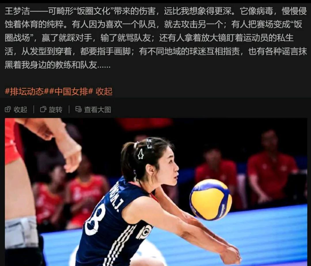 王梦洁说受到排球饭圈文化严重伤害暗指那些人?有利益关系,为了竞争的一个主力位置,为了进奥运会或国家大赛的位置才会产生饭圈。另一种是靠强大的资本推动宣传,为了抬高个人的商业价值和利益而打压有关联的球员这种饭圈才最可怕。还有一种是地方利益冲突形成的裙带关系造成的饭圈。就像天津极端粉和江苏极端粉丝互相推脱,互相伤害造谣生事形成饭圈文化。最后一种是盲目崇拜为了吹捧自己偶像而贬低有关联的球员。 王梦洁根本算不上很出名排球明星,那肯定没有背后资本的推动。那就是为了竞争自由人主力这个位置才会让王梦洁受到饭圈严重的伤害。不用多推论很简单能有关联的球员其实没有几个,一个早已经退役的自由人福建林莉一直以来都很低调很老实。她的个人极端粉丝会不会造谣生事个人觉得不太可能。唯有那些想进国家队,想让王梦洁早点退役空出一个位置。让自己偶像能够上位的极端粉丝才会恶意攻击,才形成排球饭圈文化让球员受到伤害。