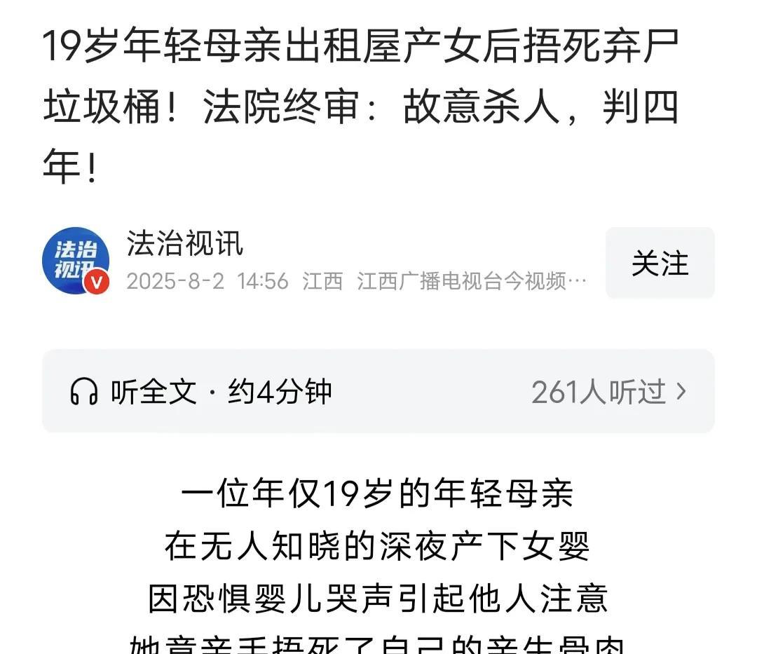 广州,19岁女子深夜在厕所,产下一个女婴,婴儿不停啼哭,女子怕被人知道,多次捂住婴儿口鼻、掐脖子,等娃没动静了,将她装进黑色塑料袋,在次日,扔在垃 圾桶旁边,打车离开广州,谁料,一清洁工从垃 圾袋倒 出一个婴儿,吓的慌忙报警,这下女子悲剧了。 8月2日法治视讯报道一件女子亲手捂死刚出生的女儿,丢进垃 圾桶,最后付出惨痛代价的案例,让人唏嘘。 2024年5月22日深夜,一个出租屋里上演着残酷的一幕。 19岁的女子黄某一个人,突然要生了,她忍着分娩的痛苦,在厕所生下了一个女婴。 初为人母的黄某没有一丝欢喜,内心全是对这个小生命的恐惧,她生怕被人发现自己生了孩子,影响了自己以后的生活。 慌乱之下,黄某没有生出一丝怜悯,为了不让婴儿啼哭,竟然捂住她的口鼻,还扼压婴儿颈部。而这种残忍的行为,黄某却多次实施。 终于,弱小的生命不再动弹了! 黄某找了一个黑色的塑料袋,把她的亲生女儿,那个不动的婴儿装了进去。 这一番折腾下来,黄某也累了,加上刚生产完身体也耗尽体力,她睡了过去。 同年5月23日晚上6点左右,黄某把一黑色塑料袋扔在了一个垃 圾桶旁边。 不知道是出于恐惧,还是清醒了过来,黄某打了顺风车离开了广州。 也许是命运的安排,黄某走了没多久,一清洁工皮某像往常一样清理垃 圾,翻到一个黑色塑料袋时,却从里面倒出来一个婴儿。 皮某被吓够呛,慌忙报警。 2024年5月25日,黄某在老家被抓。 原来,黄某有一个男朋友欧阳某,二人在一起3年多。 据黄某讲,她也不知道什么时候怀孕的,没有来月经,她以为是自己作息不规律。 到了2024年3月,黄某才发现自己怀孕,因为她感觉到肚子里有动静。 黄某羞于启齿,不敢让人知道自己怀孕的事,一直想找机会流产,所以,她从没去医院检查过。 事情发生后,欧阳某说,他不知道黄某怀孕,两人有三四个月没见面了。 另外,黄某的父母在外地打工,他们称,“只在过年时见过女儿,那时候女儿穿的宽松睡衣,平时不出屋,”所以,其父母也没发现女儿怀孕的事。 黄某的无知,不仅仅是对生理知识的缺乏,更是逃避现实,以及对生命的漠视。 有人说,生了她即使把她丟了,也是留人一条命,虎毒尚且不食子呢,哪怕你给她送人呢,非要把她弄死,就为了怕人知道,真是自私又狠心啊。 也有人说,再怎么样也是黄某自己不自爱才造成的,居然让无辜的婴儿给她买单。19岁了是一个成年人了,没吃过猪肉还没见过猪跑吗?这么大个人了,当你享受的时候你就要接受随时怀孕的风险,再说了,一开始不知道怀孕,后面知道了也坚持把孩子生下来了,为什么不能告诉孩子父亲,一起承担责任,那是一条命啊! 黄某作为母亲她没有承担应尽的责任,没有处理事情的能力,更没有给孩子应有的爱和保护。 这场悲剧让人深刻认识到,无知并不可怕,可怕的是对无知的放任和对责任的逃避。 法院一审认为,黄某将新出生婴儿杀害,犯故意杀人罪,但她年纪小,加上归案坦白,应当从宽,并认定情节较轻,判处有期徒刑4年。 不过,黄某不服上诉。 黄某一方给出理由,对婴儿捂嘴、掐脖子,只是不想让她哭,该行为应属于过失,不构成故意杀人罪,希望从轻处罚。 二审法院会如何认定呢? 《刑法》第232条规定:故意杀人的,处死刑、无期徒刑或者十年以上有期徒刑;情节较轻的,处三年以上十年以下有期徒刑。 黄某19岁是成年人了,应该知道弱小的婴儿遭受被捂嘴、掐脖子会导致呼吸困难,造成窒息甚至死亡的后果。 可是,黄某还是那么做了,婴儿不动了之后,她连救都没救,反而将婴儿装进黑色塑料袋,扔到垃 圾桶旁边,最终,婴儿死亡。 法医鉴定为,女婴被人扼压颈部,造成呼吸道阻塞,导致机械性窒息死亡。 第一、黄某认为自己的行为属于过失,但前后矛盾,如果是过失,她发现婴儿没了动静,就应该立刻施救,而不是将婴儿装塑料袋丢弃。她这行为明显属于故意。 第二、黄某多次对婴儿捂口鼻、掐脖子,该行为存在故意,并且方式极端,她的行为直接造成婴儿的死亡结果。 第三、黄某把婴儿装塑料袋丢弃,试图掩盖犯罪行为,这也说明了她有主观恶意。 因此,二审法院认为,黄某的行为对方故意杀人罪的构成要件。 并且,认为一审量刑适当。 最终,二审法院判决,驳回黄某上诉,维持原判。 有人对此提出疑问,生命延续的是女性(母亲的)和男性(父亲的),而且如果只有女性一个人,不知道要如何怀?所以怀了,男性似乎责任更大吧,如果男性不负责,女方和孩子俩人要怎么办呢? 你觉得这件事中,黄某的男友要什么责任呢?欢迎评论区讨论 关注@福康说法 从日常点滴学法律,生活安稳更有底 图片来源网络