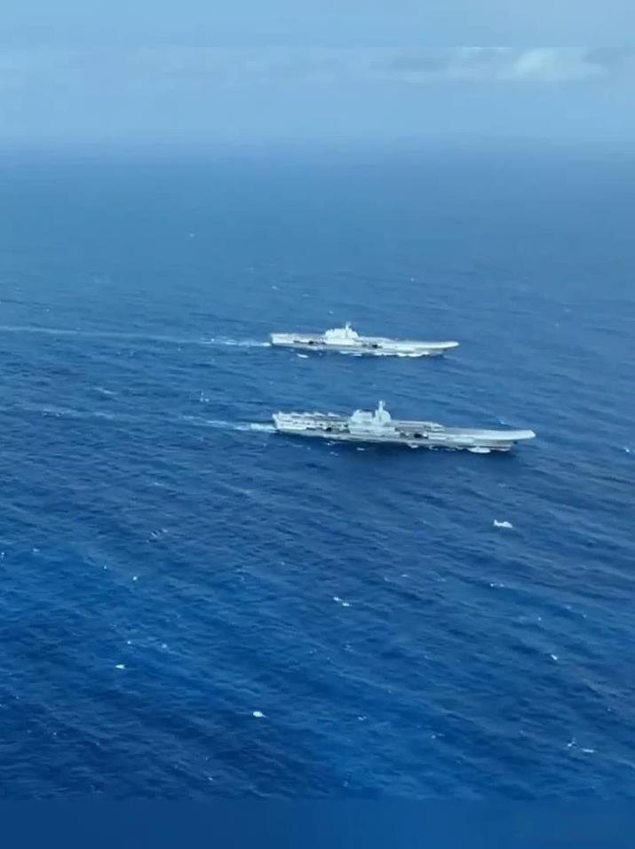 官方终于公布中国海军首次在西太平洋部署双航母战斗群的合影,画面中辽宁舰、山东舰打