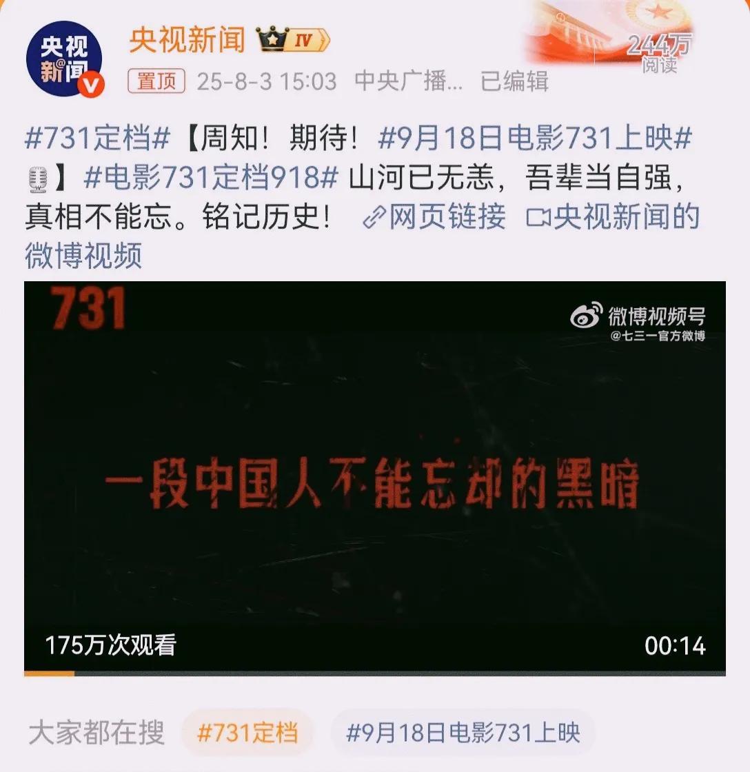 当央视新闻宣布《731》定档9月18日,说明已经突破了重重阻碍,也很明显是一种国家意志的体现。 而那些反对上映,说“不宜儿童”的声音,恰恰忘了:真正的保护,是让后人看清黑暗的模样,而非蒙上双眼。 让那些至今仍在闪烁其词的日本政府,在如山铁证前彻底失语,才是这部电影的意义。 说实话,我关心的不是票房,甚至不是它尺度能有多大,因为再大也大不过历史的残酷。 我揪心的是:它敢不敢,能不能,把那段最黑暗、最令人窒息的历史,毫无保留地呈现给今天的观众? 《731》能最终上映,本身就是一场胜利。 想想张纯如女士为揭露南京大屠杀真相所付出的巨大代价乃至生命,就能想象这部电影背后承受着怎样的暗流涌动。 直面如此沉重的历史,需要非凡的胆魄。 正如鲁迅先生掷地有声的呐喊:“真的猛士,敢于直面惨淡的人生,敢于正视淋漓的鲜血!” 十四载山河泣血,3500万同胞伤亡,这段浸透血泪的民族苦难史,是刻在每个中国人心灵深处的烙印。 它也时刻在警醒着我们: 遗忘历史,意味着背叛! 轻慢历史,更意味着危险!