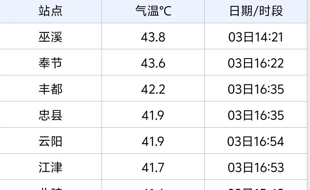 从今天的天气图实况来看,今天副热带高压依然控制了西藏东部、四川、重庆一带。华南广东、广西一带处于副热带高压外围南侧,没有受到副热带高压的控制。 从850 百帕流场图来看,广东以及广西东部一带有暖湿气流提供水汽输送,特别是广东一带部分地区还有水汽急流辐合。 从今天上午的最新卫星云图上来看四川东部、重庆、湖北、湖南一带云量较少,天气非常晴好,广东一带云量较多。 从雷达回波来看,目前广州、东莞、惠州、河源、揭阳等等不少地方都在下雨,东莞、惠州个别区域还伴随着雷电。 从今天上午10点到全国温度排行榜来看,依然是川渝主场,四川渠县37.5 度位居温度排行榜第一,在温度排行榜前10中 重庆独占7席,其中重庆合川37.1 度排第二。 8月3日下午14:21 分,重庆巫溪温度甚至达到了43.8 度。 川渝高温天气 天气非常炎热 又是收玉米的农忙时节,特别要注意防晒避暑。
