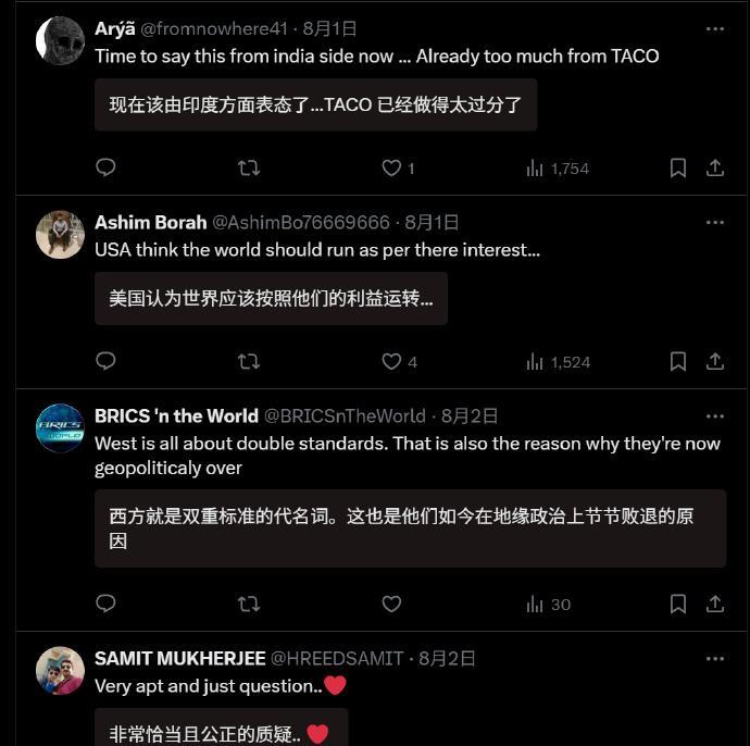 耿爽在联合国怒怼美国双标,明明自己还在和俄罗斯做生意,却不让其他国家购买俄罗斯能源。 这段霸气发言给印度人看爽了,一反常态地开始夸中国,同时不忘拉踩自己的国家,说印度要是也能这么直言不讳地怼回去就好了,除了中国,其他国家都不敢对特朗普的暴政说一句不是。 谁说他们不会急的,当关税大棒打到自己身上的时候,印度人跳得比谁都高。 不过咋说呢,被印度人夸,总感觉怪怪的[尬笑]