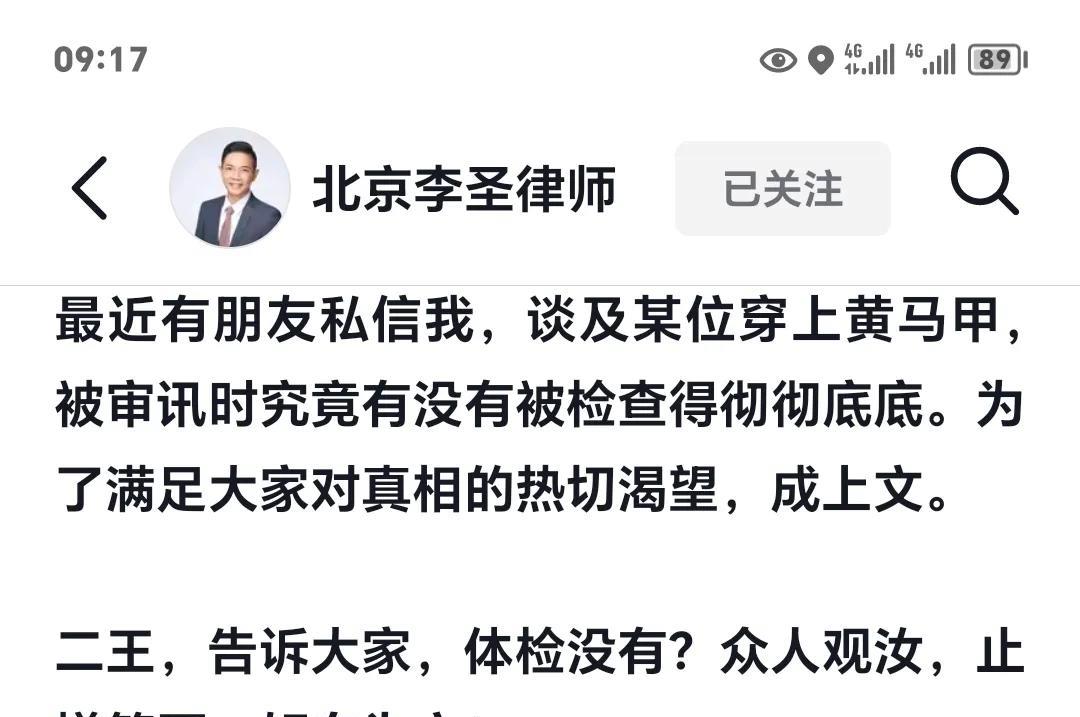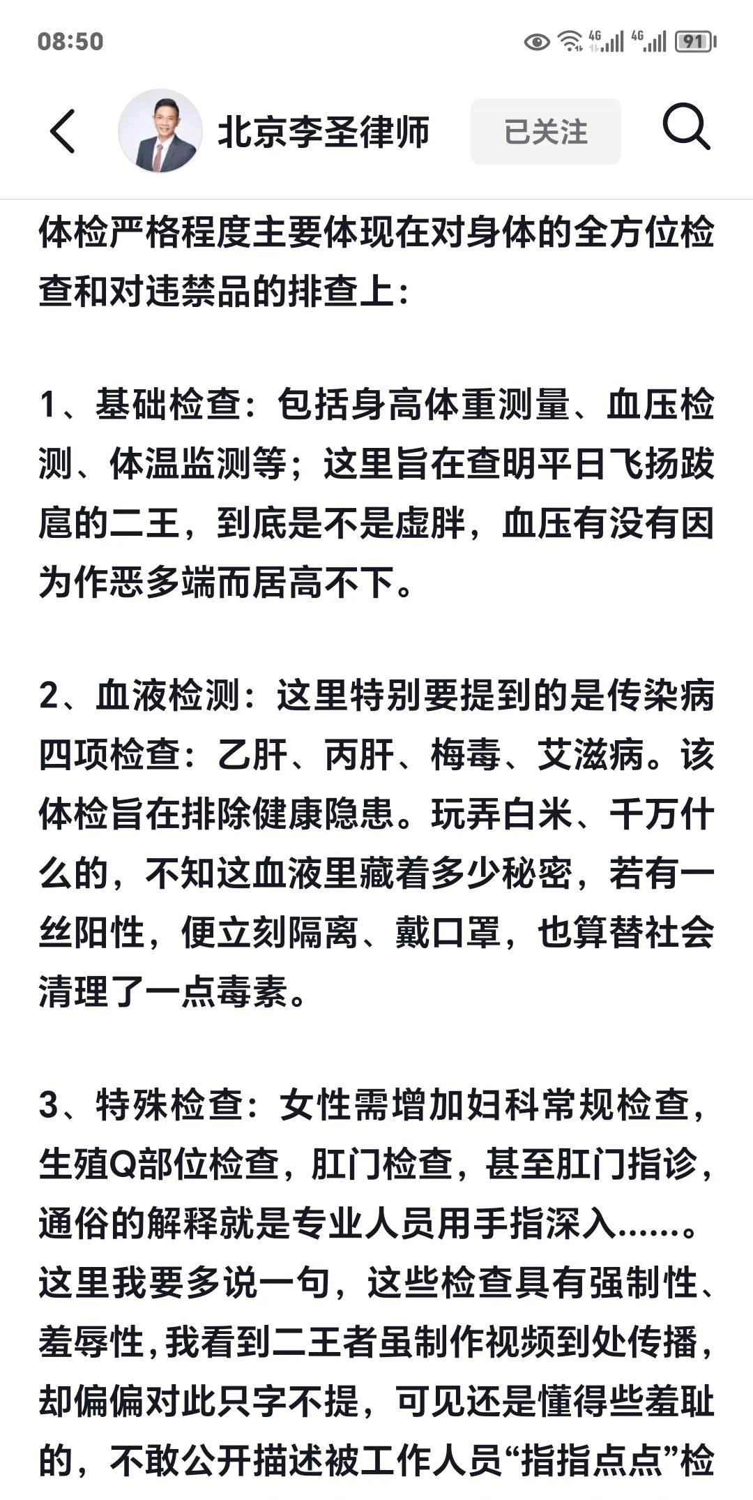 北京李圣律师 《细说大王、老王的体检》 看shou所的体检 不管你是大王、老王(虚拟、化名),也不管 你是精神病,又或者是郁抑症、焦虑症发作 不发作,或者乘着几干万、玩白米什么 的…穿上黄马甲就得体检。再犀利都没用。 穿上黄马甲、并被体检的人,由于其人生观 价值观的破烂,并不以为耻,甚至还敢制作 视频传播,其实二王没有往细里说,因为人 毕竟还是有羞耻之心的,那么问题来了,既 然他们羞于开口,我便乐于补充一这里从 专业角度进行细节补充。 首先,无论在看某所,还是拘某所,体检严格、 细致到什么程度呢,这里以大王、老王为模 拟对象,略作介绍,请大家注意,这里只是 模拟,切切不可对号入座,也希望警示到大 王、老王,在接下来的狱中生活、监外生活 中都要做到遵纪守法,话不多说,列为围观 体检严格程度主要体现在对身体的全方位检 查和对违禁品的排查上: 1、基础检查:包括身高体重测量、血压检 测、体温监测等;这里旨在查明平日飞扬跋 扈的二王,到底是不是虚胖,血压有没有因 为作恶多端而居高不下。 2、血液检测:这里特别要提到的是传染病 四项检查:乙肝、丙肝、梅毒、艾滋病。该 体检旨在排除健康隐患。玩弄白米、干万什 么的,不知这血液里藏着多少秘密,若有一 丝阳性,便立刻隔离、戴口罩,也算替社会 清理了一点毒素。 3、特殊检查:女性需增加妇科常规检查, 生殖Q部位检查,肛门检查,甚至肛门指诊, 通俗的解释就是专业人员用手指深入…。 这里我要多说一句,这些检查具有强制性、 羞辱性,我看到二王者虽制作视频到处传播, 却偏偏对此只字不提,可见还是懂得些羞耻 的,不敢公开描述被工作人员“指指点点”检 查的滋味。要不她早就制作回忆视频来吸引 我们接着说,体检过程需完全暴露身体,要 求二王按指令完成360度转身、抱头等动作, 确保无遗漏检查区域。该体检旨在排除利用 身体夹带违禁品,以确保没有藏污纳垢的可 能,保证每一寸羞辱都精准到位,不留死角。 毕竟他们平时为非作歹的手段如此精密,检 查怎么能不精细周全? 4、衣物检查:需脱掉所有衣物,当然包括 内裤,检查是否存在金属纽扣、拉链等违禁 品,若发现金属部件会当场剪除或丢弃。该 体检旨在确保后续监管安全,防止抑郁症、 焦虑症、精神病等自杀自残风险。二王不管 长发短发,也不管那些精致,就这样被粗暴 地剪裁一番,恰好给他们上了生动的一课: 什么叫作茧自缚,什么叫一丝不挂。 好,话说回来,体检虽羞辱,却意义重大一 一是确保后续监管安全,二是防止二王玩弄 郁抑症、精神病把戏,自残自伤来逃避法律 最近有朋友私信我,谈及某位穿上黄马甲, 被审讯时究竟有没有被检查得彻彻底底。为 了满足大家对真相的热切渴望,成上文。 二王,告诉大家,体检没有?众人观汝,止 增笑耳,好自为之!