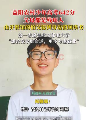 “来不及了,我不上985了!”近日湖南益阳,18岁高考考生考了642分(物理类),超湖南一本线近200分,谁料,填报志愿时,他却放弃985选择北邮计算机专业,网友了解到他家里的情况后,感叹:现实就是这么残酷! “北邮计算机系毕业生就业前景好,我得早点工作赚钱,让父母的生活能轻松些。”周糠顺面对网友的惋惜信誓旦旦地说道。虽然自己考出了642的高分,但现实并没有让周糠顺如愿以偿的爆开高校。 周糠顺的家庭情况十分艰难。他的父亲腿部有残疾,身体的不便使得他只能从事保洁这类辛苦且收入微薄的工作,每日早出晚归,只为了赚取那维持家庭基本开销的微薄薪水。而他的母亲患有智力障碍,需要长期服药来控制病情,这无疑又给这个本就不富裕的家庭增添了沉重的经济负担。 周糠顺亲眼目睹了父母为家庭付出的艰辛,也深切体会到了生活的不易。他明白,自己不能仅仅追求名校的虚名,而是要从实际出发,考虑如何能够尽快就业,为家庭带来稳定的经济收入。 周糠顺的成长经历充满了常人难以想象的艰辛。12岁那年,一场意外导致他肠断裂,家里连10万元手术费都凑不齐,最后是靠学校募捐才得以救治。高中三年,他每天5点起床,往返于学校和伯父家之间。凭借着自己求学地毅力,考出了好成绩。 “计算机专业毕业的学生一出来工作,平均刚开始能拿到手的工资有25万呢。”周糠顺掰着指头,诉说着自己选择北京邮电大学的缘由。北邮地处北京,实习机会多,大二大三就有机会进入互联网大厂实习,这对急需改善家庭经济状况的周糠顺来说,无疑是最佳选择。 这个决定在网上引发了激烈讨论。有网友认为:“985的平台更广,未来发展空间更大。”但也有人反驳:“对于寒门学子来说,实实在在的就业比虚无缥缈的未来更重要。”教育专家李教授指出:“周糠顺的选择体现了一种务实的教育观,在家庭条件有限的情况下,优先考虑就业是完全合理的。” 让人倍感暖心的是,在知悉周糠顺的具体状况后,北京邮电大学迅速行动,特意派遣招生老师奔赴湖南,亲手将录取通知书交到他手中。同时,学校还郑重承诺会为他提供助学金以及全方位的学业帮扶。此外,阿里公益天天正能量也向他伸出了援手,为他颁发了一万元的奖学金。 信息来源: 潇湘晨报·晨视频|2025.7.14《益阳农村少年高考642分,父母都是残疾人,由开餐馆的伯父接到身边照顾读书,第-志愿是北京邮电大学,“想改变家庭命运,更多考虑就业”》 文|何夕 编辑|史叔