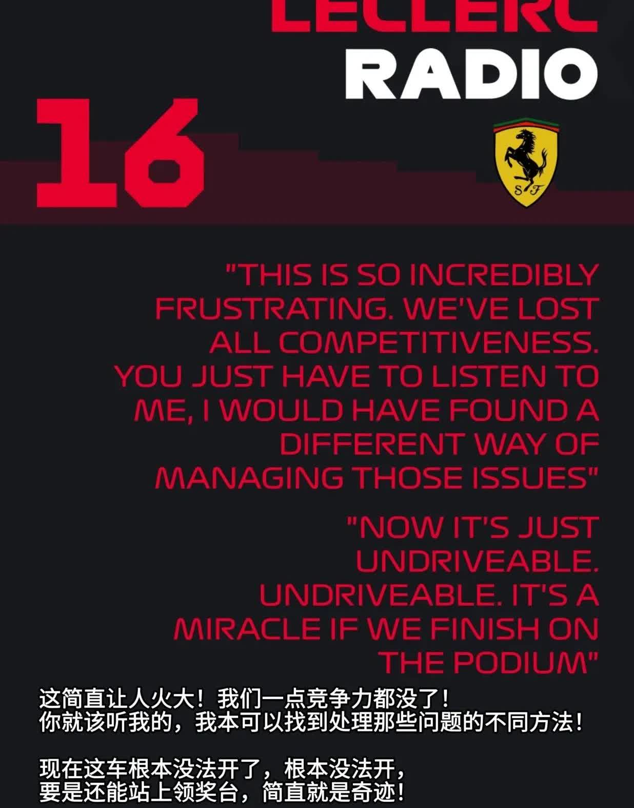 勒克莱尔赛后向法拉利道歉! 勒克莱尔认为自己在没有了解到事情的真相就不分青红皂白地在tr里批评车队,赛后他向车队正式道歉!“在车里的时候,我掌握的信息并不全面,现在我掌握了。我们在第40圈遇到了底盘问题,从那一刻起我无能为力,车里弥漫着沮丧的气氛,我以为是我们的另外一个选择出了问题,我以为是因为进站时车队对我的前翼做了一些过于激进的改动,导致后来情况变得更糟糕,然后我感觉到赛车的异常表现,它不太稳定,几乎每个弯都会出现一些异常,但事实并非如此。失望和沮丧是肯定存在的,我得收回我在tr里说的话,因为我以为问题出在赛前讨论过的一件事上,下车后我得到了更多细节,这实际上是底盘的问题。”