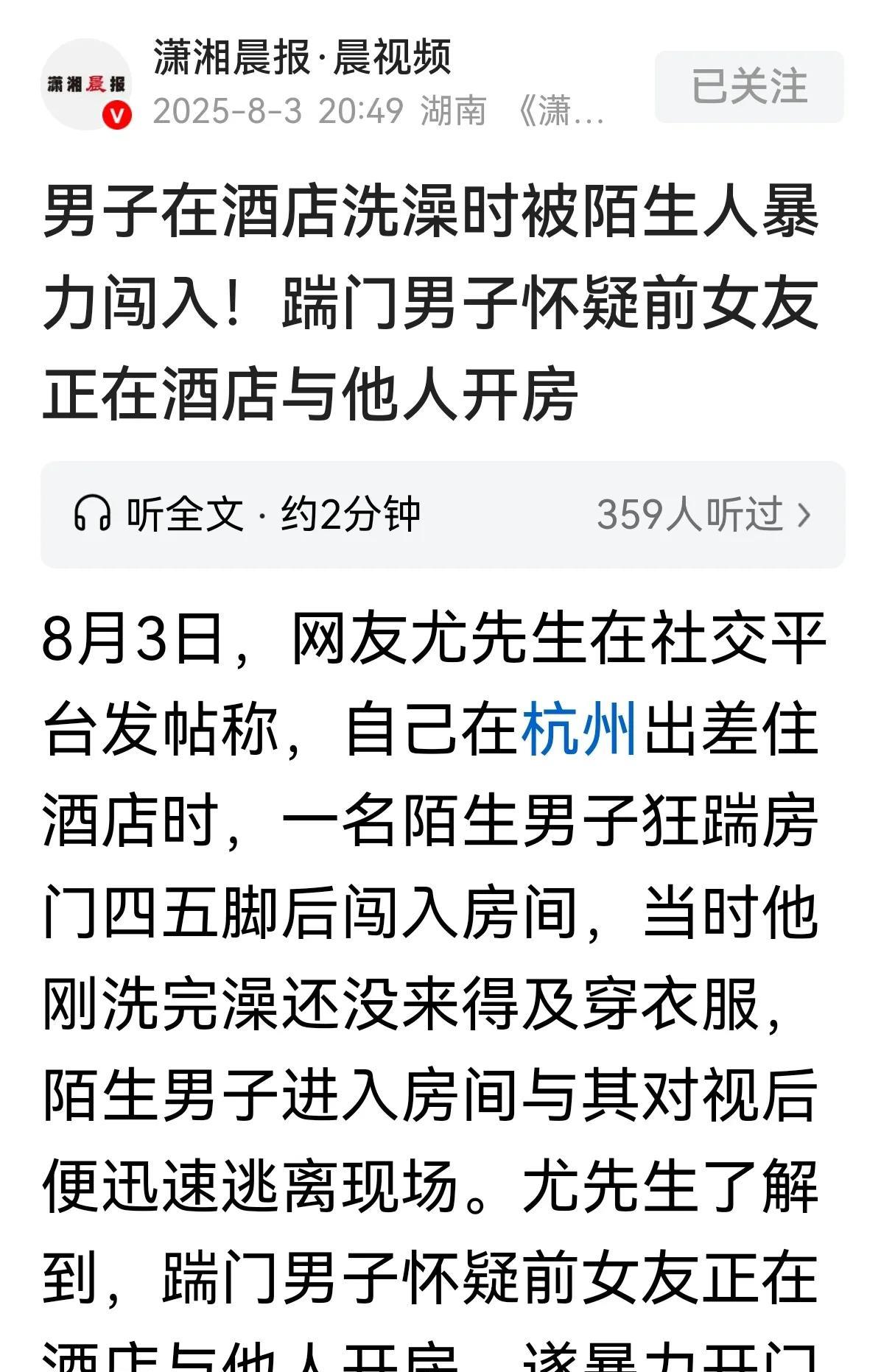 浙江杭州,一男子怀疑前女友跟自己哥们在宾馆开房,他崩溃了,凌晨4点,他潜入宾馆,扒着房间门一间一间地听,他听到有个男子正在洗澡唱歌,跟哥们的声音很像,他气血上涌,强行踹门闯入,他和一丝不挂的男子四目相对后,突然撒腿就跑,这下事闹大了。 8月3日,据潇湘晨报·晨视频报道,7月21日,尤先生和4个同事一起去杭州出差,他们定了一间家庭套房。 凌晨4点左右,5个人入住酒店分好床位后,2个同事负责去便利店买宵夜冲击,另外2个同事躺床上边刷手机边休息,而尤先生是个爱干净的人,他进入浴室冲凉。 尤先生冲凉有个习惯,那就是边唱歌边洗澡,他喜欢唱歌,而且这样洗澡也不觉得乏味了。 可当尤先生洗完,正在擦身上的水迹,还没来得及穿衣服时,突然,门外传来剧烈的踹门声。 第一声踹门声响起,尤先生理以为是买夜宵的同事回来了,他心里纳闷,同事不敲门反而踹门,这也太野蛮了吧。 尤先生一丝不挂,当然不会跑去开门,另外2个休息的同事也没来得及跑去开门时,随着第二次踹门声,门框已经出现了裂缝。 尤先生这才感觉到不对劲,门外的人气势汹汹,来者不善,肯定不是同事,他出于本能,赶紧往房间里跑,而此时,有个陌生男人已经破门而入,此人怒发冲冠,咆哮如雷:“姓孙的……”。 陌生男子和浑身上下不着寸缕的尤先生四目相对,男子立马呆若木鸡,随后,缓过神来的他撒腿就跑,留下尤先生和同事面面相觑。 原来,30岁左右的陌生男子,怀疑前女友和他的一个朋友关系不正常,他也不知道在哪里查到了蛛丝马迹,认为女友和哥们在宾馆开房,怒气冲冲来抓现行。 男子潜入酒店,酒店那么多房间,他不知道他们在哪个房间,这难不住他。他趴在门上挨个听动静。 正巧,尤先生唱歌的声音,和男子朋友的嗓音很像,就气急败坏的破门而入,把刚洗完澡的看光光,才发现自己踹错了门,找错了人,于是男子逃之夭夭。 最终,男子被找到,酒店和男子赔偿尤先生6000元。 有人认为,这男人无理取闹,前女友与你毫无关系,有必要去抓现场吗?这只是赔钱就能了事的问题吗? 男子因怀疑前女友而情绪失控,非法侵入他人客房,不仅践踏了法律底线,更严重侵犯了他人的隐私权与人格尊严。 无论出于何种缘由,暴力闯入他人私密空间的行为都绝不可取,法律对公民私生活安宁的保护不容侵犯。 酒店管理亦存在疏漏,为侵入行为提供了可乘之机。 处理感情纠纷需理性克制,冲动与暴力只会带来法律制裁与社会谴责。 《刑法》第245条规定:非法搜查他人身体、住宅,或者非法侵入他人住宅的,处三年以下有期徒刑或者拘役。司法工作人员滥用职权,犯前款罪的,从重处罚。 酒店客房虽非长期住所,但入住期间属于受法律保护的“临时私密空间”,闯入行为破坏了他人的私生活安宁与空间安全。 男子未履行登记手续,通过踹门方式强行侵入尤先生居住的房间,已符合“非法侵入他人住宅”的客观行为要件。 男子因怀疑前女友在酒店与他人开房,采取踹门方式闯入客房,具有直接故意和明确的不法目的,主观恶性明显。即使误认房间,也不影响犯罪故意的认定。 《民法典》第1032条规定:自然人享有隐私权。任何组织或者个人不得以刺探、侵扰、泄露、公开等方式侵害他人的隐私权。隐私是自然人的私人生活安宁和不愿为他人知晓的私密空间、私密活动、私密信息。 尤先生处于全裸状态,属于“私密活动”范畴,男子闯入后目睹其裸体,构成对隐私权的直接侵害。即使未公开传播,侵入私密空间并窥视他人身体的行为已违反民法典对隐私权的保护。 酒店和男子共同赔偿尤先生6000元,符合民法典第1183条关于精神损害赔偿的规定。 治安管理处罚法第四十条:非法侵入他人住所尚不构成刑事犯罪的,可处10-15日拘留并处500-1000元罚款。本案男子行为已达到刑事犯罪标准,故优先适用刑法。 如果酒店未尽到安全保障义务,如未核实访客身份、未及时阻止侵入,可依据《民法典》第1198条承担补充赔偿责任。 本案中酒店与男子共同赔偿,可能基于其管理失职。 本案男子行为同时触犯《刑法》第245条非法侵入住宅罪与《民法典》第1032条隐私权侵害,需承担刑事与民事双重责任。 虽本案以赔偿和解告终,但从法律性质看,男子可能面临刑事追责三年以下刑期或拘役,而民事赔偿已体现对隐私权的保护。 大家应引以为戒,非法侵入他人私密空间的法律后果严重,情绪冲动下的暴力行为不可取。 对此,你怎么看? 关注@灋律盐究员 学法辩是非,用法止纷争。