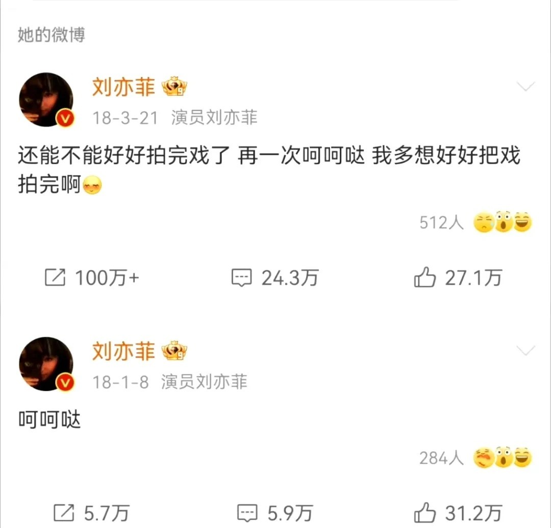 赵露思有多大胆? 刘亦菲和赵丽颖不敢干的事, 她硬是干了! 大家还记得赵丽颖发的汉堡图吗?那是她产后付出,接拍的第一部剧,《有匪》,原著世界观宏大,女主的自我成长线很精彩,但电视剧改编了很多,于是赵丽颖发了一个汉堡图片,配文原著,和改编。 那是她在拍摄期间就发的图片,可见当时她很气愤,但还是坚持拍摄完成; 同样刘亦菲,发了两次:呵呵哒,因为自己拍摄的《南烟斋笔录》被注水严重,女一戏份被删减,即使这样,刘亦菲也坚持完成拍摄。 因为这是职业的底线,不能越过。 到赵露思拍《恋人》同样的剧本剧情问题,她受不住了。直接罢演了。 即使当时身体不适,确实要恢复修养,到直到今天,她参加完综艺,参加完音乐节,发文控诉公司,她啥都干了,就是没有回去补拍。 大家本来都是上桌好好的打工人,有情绪,有不平,可以发泄,但是不能掀桌子,直接一句:姐不干了! 真的是,看似潇洒了,实际极度的不负责任。 契约精神,白纸合同难道是儿戏吗?是谁弱谁有理吗? 当年章子怡拍摄《一代宗师》已经被王家卫逼得极度崩溃,才大胆提出休息一天整顿。 因为停工一天就会花费很多钱。她深感不安。 但赵露思却没有这份敬畏和责任心。 所以这两天,她发文控诉,又直播,但普通路人共情她的人已经很少了。 大家觉得呢?