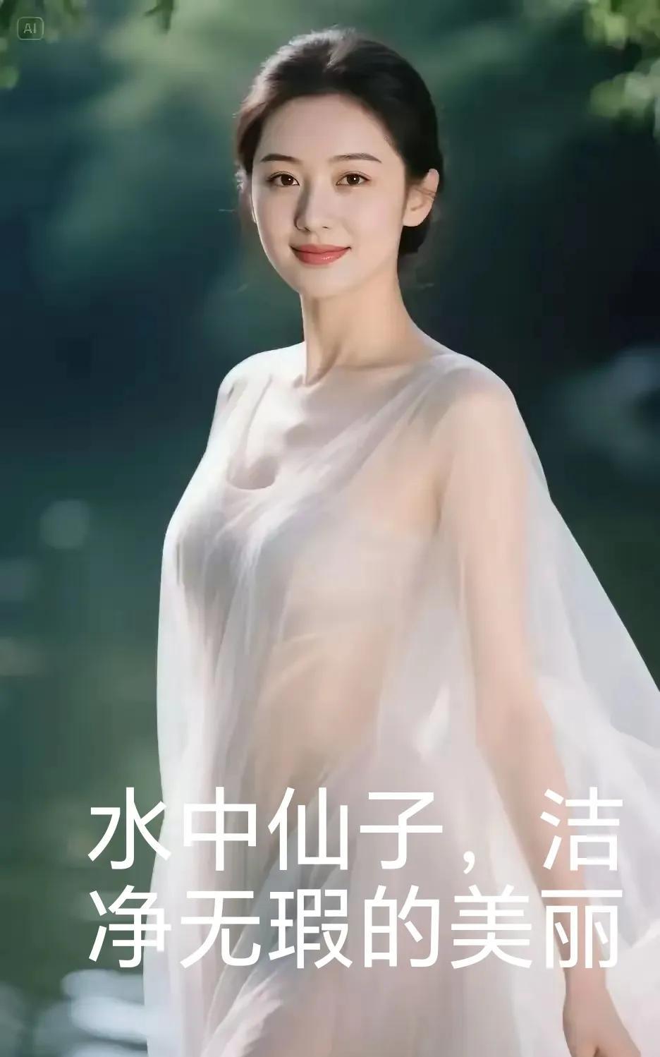 素衣袅袅立水滨,疑似仙娥下凡尘。 玉质冰肌清韵在,一颦一笑动心神。