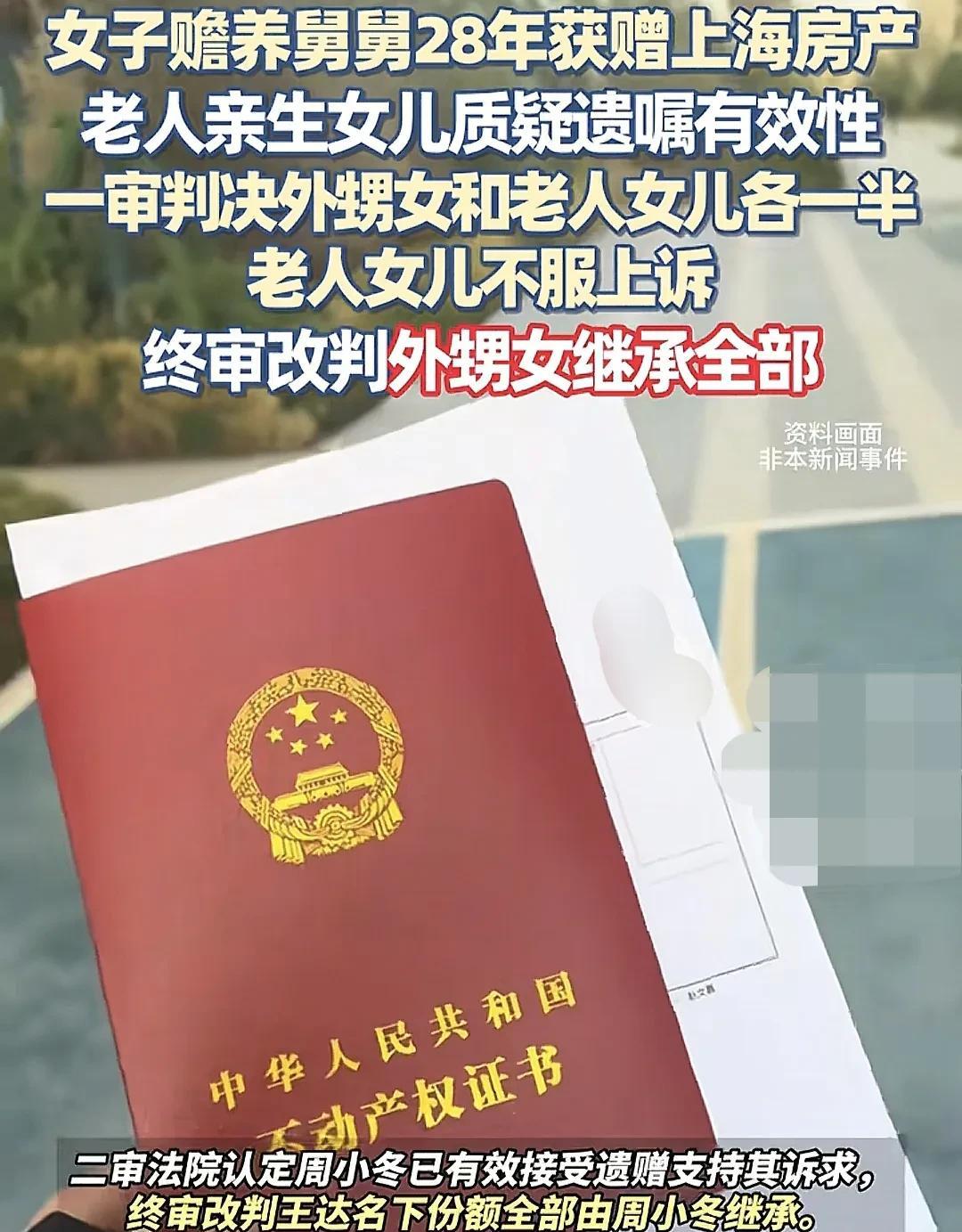 女子从外地来上海投靠舅舅,帮衬他做生意,一直和舅舅住在一起,照顾他28年,舅舅心寒女儿不管自己,立下遗嘱,将房子留给外甥女一人,老人去世后,女儿不认可遗嘱,将女子告上法庭,一审判决房产外甥女和老人女儿各一半,老人女儿不服,二审判决让人意外。 8月2日看看新闻报道,老人感激外甥女照顾自己28年,立下遗嘱将房子留给外甥女,老人去世后,他女儿却不干了。 多年前,周小梅(化名)从外地到上海投靠舅舅王大爷。 那时候,王大爷做生意身边也缺人手,正好外甥女来了,就让她帮衬着做生意,一来亲人可以信任,二来也给她一个出路。 而后,周小梅就一直和王大爷住在老人的房子里,照顾他的生活起居,也十分用心。 王大爷逐渐年纪大了,身边一直是周小梅照顾,而女儿王丽却不管他。 因此,王大爷曾常和邻居抱怨,“女儿不管我,不想跟她住。” 其实,王大爷心里有数,他虽然年纪大了,但不糊涂,看着外甥女尽心尽力照顾自己,亲生女儿不管自己,他对女儿寒了心。 2009年,王大爷立下公证遗嘱,等他百年以后,名下的房屋份额由外甥女周小梅一人继承。 王大爷立下遗嘱,也是不想让外甥女白白付出。 原来,王大爷老伴早就去世了,他只有一个女儿,他名下房子在浦东新区,在2001年的时候,他给房屋登记产权时,写了他和外孙女小高的名字,两人各占50%的份额,也就是说,这套房子他和外孙女一人一半。 不过,王大爷和外甥女周小梅一直住在这套房子里。 就这样,周小梅照顾舅舅王大爷28年,给他养老送终。 2020年,九旬的王大爷离开了人世。 老人去世后,女儿王丽和外孙女小高对这份遗嘱都不认可,竟然一纸诉状将周小梅告上法院。 王丽认为,第一,所谓的遗嘱没有证据证明是否存在。 第二,周小梅没在规定时间(60日)内明确表示接受遗赠。 所以,王大爷那50%的房产份额,应该按照法定继承,归女儿王丽继承。 首先,王大爷这套房子的份额,在他和外孙女小高名下,各占50%的份额,王大爷立下公证遗嘱,明确自己那份由周小梅继承。 本案争议焦点: 王大爷去世后,女儿王丽和小高不认可遗嘱,认为周小梅没有在60天内明确表示接受遗赠。 《民法典》第1124条规定:受遗赠人应当在知道受遗赠后60日内,作出接受或者放弃受遗赠的表示;到期没有表示的,视为放弃受遗赠。 所以,王丽要继承王大爷那50%的份额。 周小梅则说,第一,她丈夫在舅舅去世后两周内就把公证遗嘱照片发给了小高。 第二,周小梅一直保管王大爷那套房子的房产证。 第三,周小梅多次和邻居口头表示过,舅舅写了遗嘱把房子留给我。已经明确表达了接受意愿。 一审法院认为,周小梅提供的证据,比如丈夫发遗嘱照片、口头表示,不够直接,不能证明她在60天内明确接受了遗赠,所以按法律规定视为放弃。 不过,考虑到周小梅照顾了王大爷28年,不该白付出。 《民法典》第1130条,对被继承人尽了主要扶养义务或者与被继承人共同生活的继承人,分配遗产时,可以多分。 一审认为,周小梅对舅舅尽到较多了抚养义务,应该分她一部分遗产。 一审法院判决:王大爷的房子份额由女儿和外甥女各继承一半。 一审判决后,王丽不服,而周小梅也不服,提起上诉。 二审法院认为,接受遗赠的表示形式不限于书面,口头和行为也算。 认为,《民法典》只要求受遗赠人在60天内“作出表示”,但没限定必须是书面形式,口头、行为甚至特定举动都可以,只要能证明有接受的意思就行。 首先,王达去世后,周小梅的丈夫在两周内就把遗嘱照片发给了小高(外孙女),说明周小梅一方及时传达了遗嘱内容。 其次,周小梅一直保管着房产证,没交出去,这可以视为“用行动表示接受”。 最后,亲戚作证,老人去世后,小高曾打电话说周小梅发了遗嘱照片,进一步证明周小梅没有隐瞒或放弃。 周小梅作为非法定继承人,却用28年时间照顾老人,远超一般亲属的义务。如果因为“没写书面声明”就剥夺她的继承权,显然不符合社会公序良俗。 最终,二审法院判决:王大爷名下房产份额全部由外甥女周小梅继承。 有人说,外甥女照顾舅舅28年,这个确实是真情。人生能有几个28年,再说这28年女儿去哪里了,就算去海外,难道可以不管老人了吗? 首先这个老人肯定就很好,不然外甥女也不会愿意照顾,其次这个外甥女也很好,不然也不能坚持28年。 谁给养老,东西就留给谁,如果这遗嘱都没有效,以后想拿房子换个老有所依,都没人敢接啊。 就该这样,没有照顾就不该得到遗产,要不然都这样子,以后大家都没人赡养老人了。 对此你怎么看呢? 人物均为化名 关注@福康说法 从日常点滴学法律,生活安稳更有底