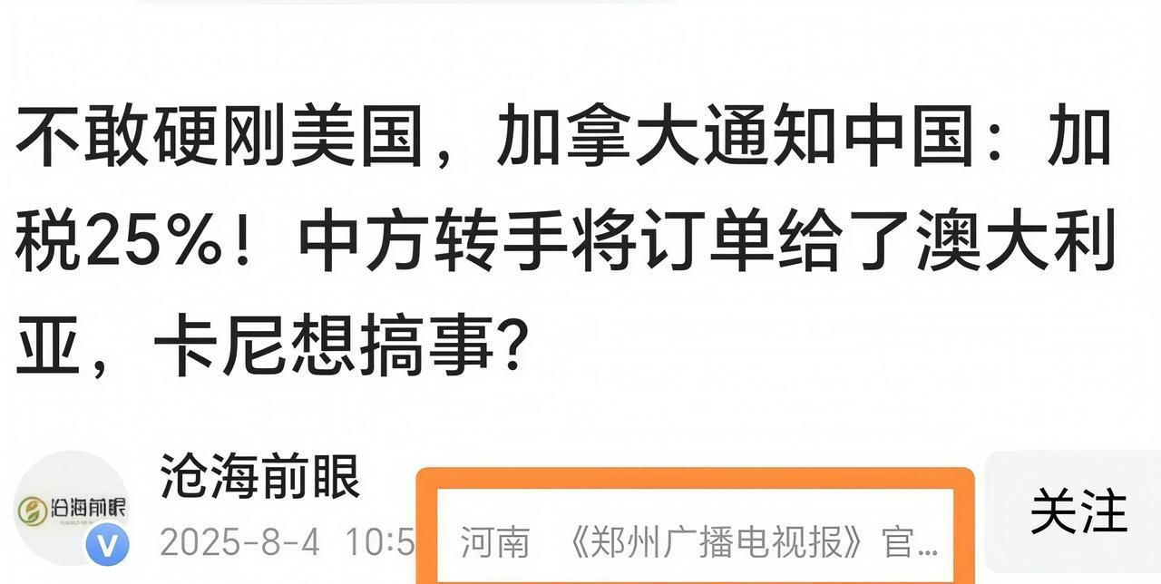 加拿大不敢硬刚美国,宣布对华加征25%的关税,结果中方转手就将37亿美元订单给了澳大利亚,加拿大农场主们不干了! 我估计,此时加拿大总理卡尼正在懵逼中,本想选边站,结果这种损人不利己的事是一点好处也没得着,因为,即使是表明了(站队美方)态度,美国方面也没给加拿大好处! 因为加拿大政府对华加税,本应7月20日从温哥华港发往中国江苏和江苏的货物,如今只能堆在码头… 而这些货物,如果中方不买,很难一下子找到这么大的客户。 而三大农产品协会也发出预警:因为中国大豆订单延迟60天,这些产自加拿大的油菜籽,在港口积压将达8000万吨,还有谷物集装箱,压港近2000柜… 可以说,中方的反击,那叫一个迅速,而且是一点面子不给。当然了,既然你不给我们面子,我们凭什么给你面子? 所以,就在加拿大政府对华加税消息公布的同时,中国中粮集团,就向澳方提交了一份高达37亿美元的农产品订单,这份订单采购的农产品涵盖油菜籽、饲料谷物等,十多个品类… 这37亿美元的订单对加拿大农场主将会造成多大的影响? 不用我多说! 不过,加拿大此举倒是成全了澳大利亚,一位参与中澳谈判的消息人士对外透露,澳方将向中方试着出口五批油菜籽,预计总量将达到15万至25万吨之间,这个数量对澳大利亚农民来说,嘴里能乐开花! 当然,我们和澳方签订的不是长期合同,而是根据形势而定。反正我们是买家,像菜籽油等这些农产品确实不缺卖家,而我们看重的则是一个态度。 如今,加拿大总理卡尼肯定有很大压力,但谁让他这么着急站队呢?要对中方加税时,当时有考虑过后果吗?不敢硬刚美国,却敢得罪我们这个大客户,但加方却不考虑,美国连块骨头都不给,这是何苦呢?