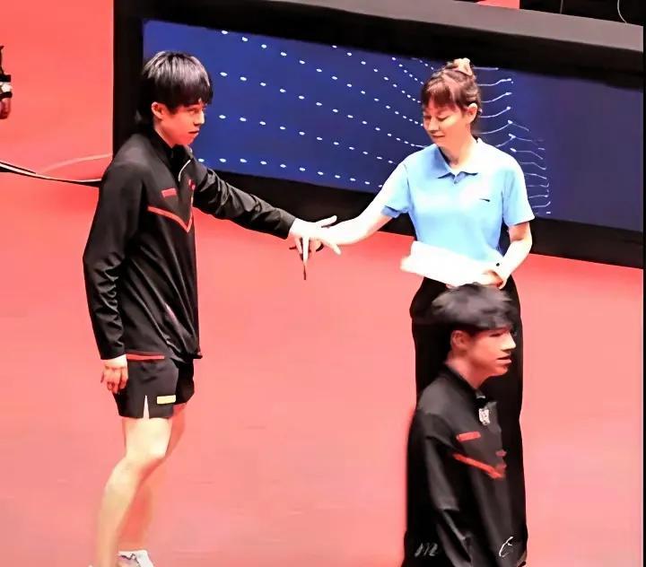 哟哟哟 头哥你这是男女授受不亲吗? 去美女手上拿球拍, 翘着兰花指。 好怕碰到美