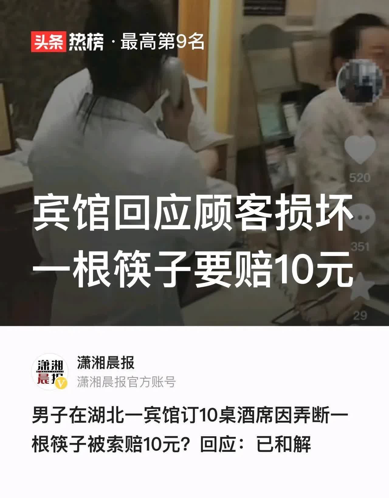 湖北,一男子在某宾馆订了10桌酒席,宴请宾客,谁曾想到,因为客人弄断了一根筷子,工作人员竟上前提醒,然后要客人赔偿10块钱!宾馆表示,“你在外面吃饭弄坏东西了,是不是要赔偿?”网友:“这不是钱的事,这是格局!” 在湖北,有个叫杨某的人为了请客,在宾馆摆了十桌大餐。大家吃得开心,聊得也高兴。可就在这时,有个客人不小心把筷子弄断了。按理说,这也没啥大不了的,但服务员却当场让客人赔十块钱。 那客人正高兴着呢,被这么一打扰,心里有点不爽,觉得宾馆太过分了。服务员呢,觉得自己没错,东西坏了就得赔。两人就这么吵了起来,话也越说越冲。后来,有人把这事儿拍成了视频发到网上,一下子就火了,大家议论纷纷。有网友开玩笑说:“连一根筷子都要赔啊?那要是打碎了碗,岂不是得赔套房子?”还有网友站在宾馆这边:“东西坏了不赔,那以后谁负责呢?”不过,大多数人觉得宾馆这次太斤斤计较了,为了十块钱丢了名声,真不值得。 其实,按照法律规定,弄坏了别人的东西确实得赔,但得按实际价钱来。一根普通筷子,最多也就几毛到一块钱,要赔十块显然不合理。 后来宾馆说,已经和客人和解了,没真的让客人赔钱,客人也继续住了。但这件事留给大家的思考还没完:做生意啊,不能只盯着眼前那点小钱,眼光得放长远点。