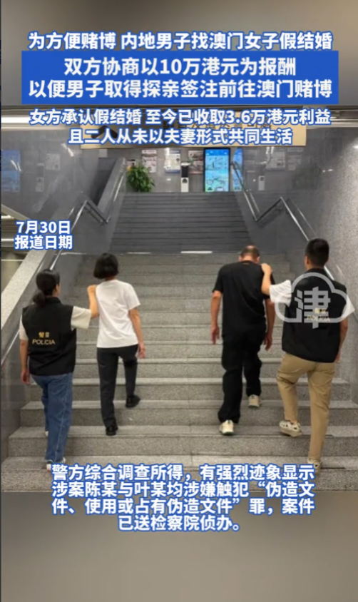 “太离谱了!”澳门,一内地男子为了方便赌博,找了一澳门女子假结婚,事成之后,男子决定给10万港元报酬,不料,女子被抓,她直呼:已经收到3.6万港元,从来没有以夫妻名义生活!网友:电视剧都不敢演的剧情!