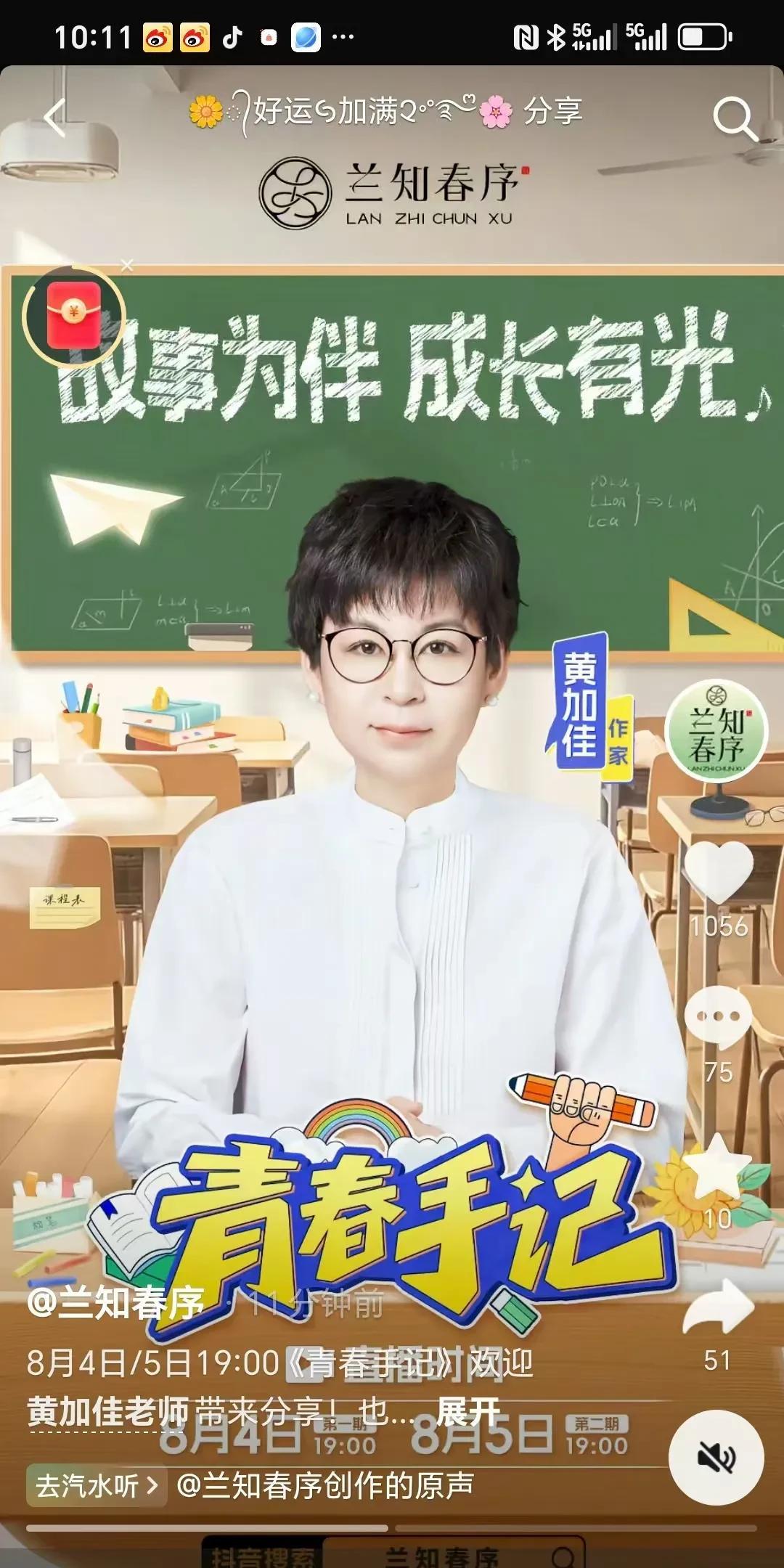 宇辉明天5号晚上8点,在与辉同行上播,6号晚上8点在兰知春序《主创请开麦》访谈。7号晚上8点在与辉同行上播。 今天晚上7点《青春手记》首播,黄加佳老师给大家讲课,内容关于儿童教育,怎么去和孩子沟通?怎样把孩子不感兴趣的事情变得有趣,和孩子产生链接? 黄老师有两个孩子,遇到的问题和大家一样,她的孩子对历史没兴趣,她就用穿越的方式引导孩子了解各个历史时期的衣食住行和当时的时代背景,孩子从无感变得自己主动参与。 有家长提问,孩子只爱看文学书,不喜欢看科技方面的书怎么办?黄老师的回答是他不想看就不勉强他,让他看他有兴趣的书就好,开卷有益,只要他愿意看书总是有受益的。