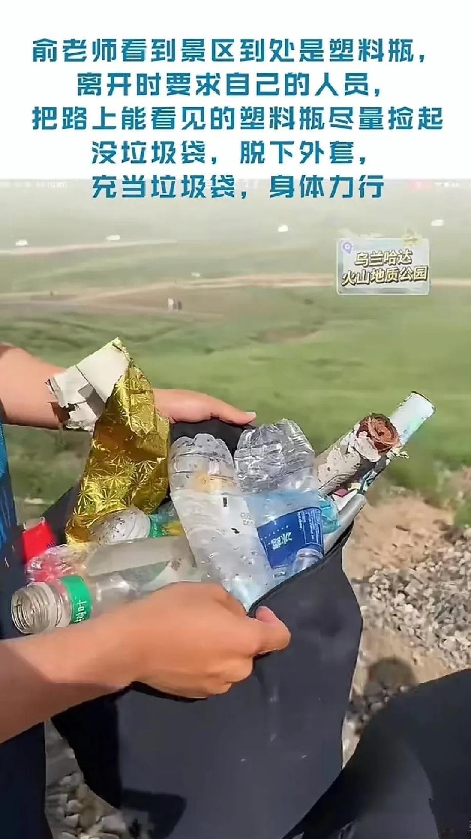 内蒙古文旅,你们那里的景区这么脏吗? 俞老师看不下去了,看到景区内到处都是塑料垃圾,于是让员工尽可能的把能够看到的垃圾捡起来,没有工具就脱下衣服装。 通过最后视频能够看到,捡到的垃圾还是相当可观的。 有没有去过内蒙古旅行的朋友,俞老师去的这个景区,乌兰哈达火山地质公园,卫生状况怎么这么的差呀?
