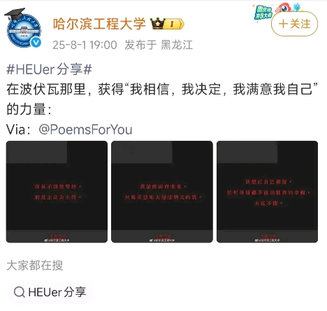 多个高校账号集中发布“女权”主义创始人语录,意欲何为? 8月1日,在“武汉大学图书馆事件”吵的沸沸扬扬的背景下,八一建军节这个特殊的日子里,复旦大学、华中科技大学、哈尔滨工程大学等多所高校官方账号集中发布伏波娃语录,这只是巧合吗?背后有什么关联? 伏波娃是谁?根据检索到的资料,西蒙娜·德·波伏娃,是法国存在主义作家,女权运动的创始人之一。这些高校引用她的作品和语录,可能是在集中表达对武大宣布查处杨某某学术不端的不满,暗搓搓声援杨女士。 经检索,此前也有多个高校曾经发布过此人语录,或者推荐她的作品。 这些高校的举动,背后存在何种关联尚不得而知,但起码可以证明,第一,这些账号的背后都是女权主义者在掌控。第二,女权势力已经成为高校中不可忽视的强大力量。第三,她们背后存在一定串联,会找一定的时机统一发声。