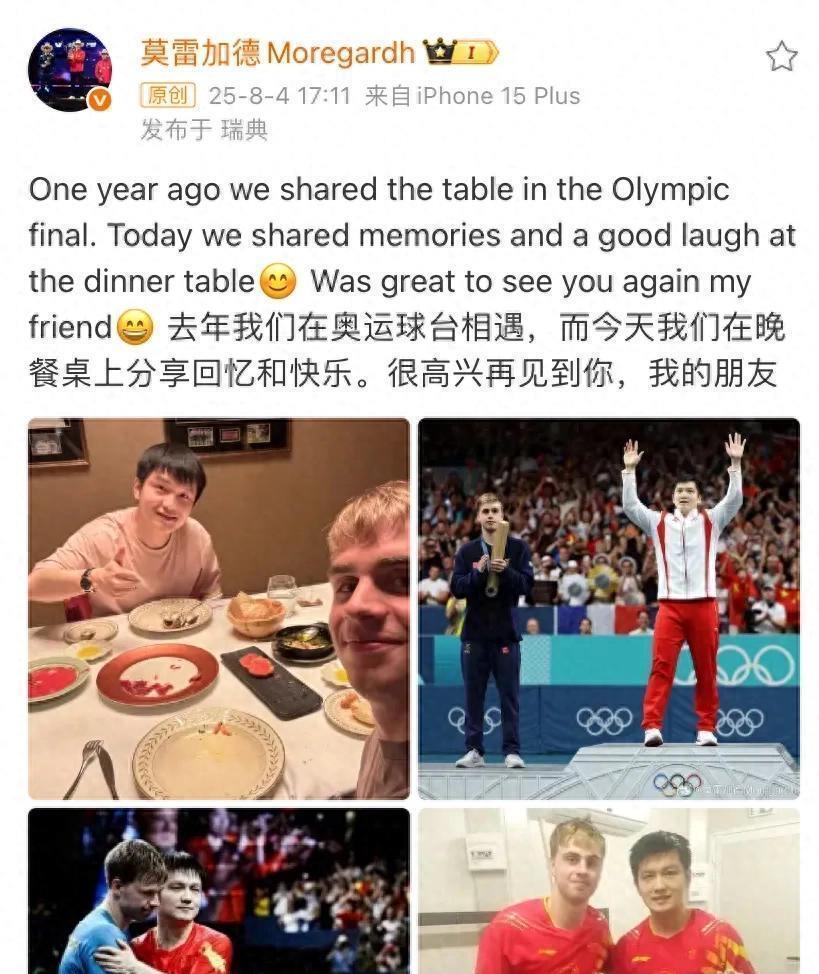 瑞典乒乓球运动员莫雷加德,晒与樊振东聚餐自拍照!两人都咧嘴笑着,樊振东正伸出大拇
