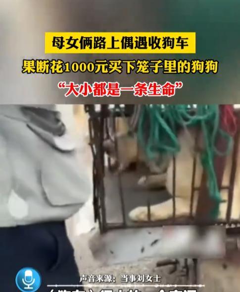 山东威海,一对母女看到收狗车的笼子里关着一只狗,两人觉得很可怜,于是和狗贩商量买