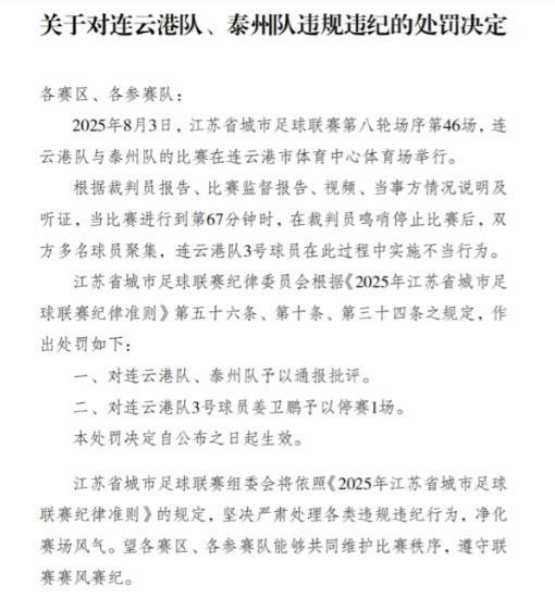 苏超联赛的连云港队和泰州队被通报批评 昨天苏超联赛的一场关键比赛,连云港队主场对