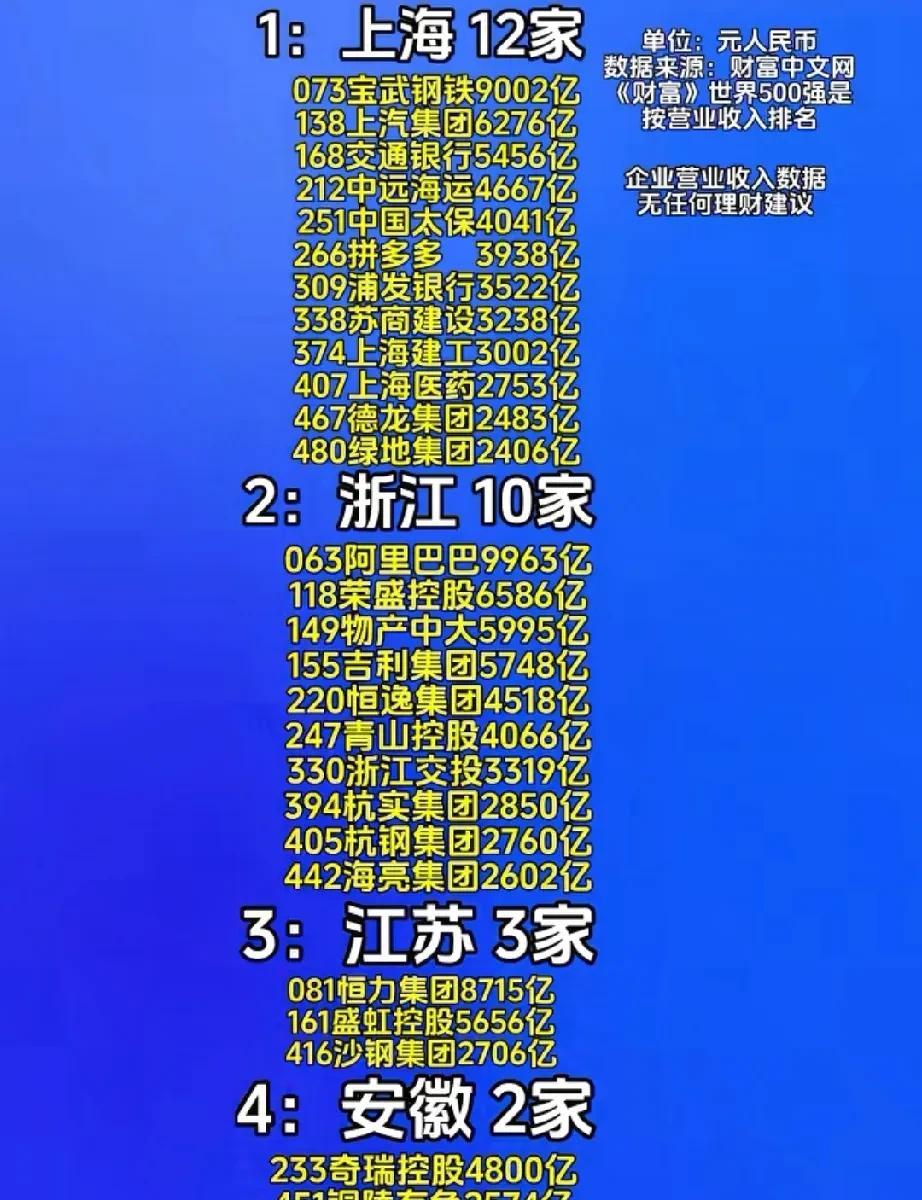 长三角三省一市的世界500强企业,上海领军,浙江崛起,江苏安徽数量靠后 2025年《财富》世界500强企业,涉及长三角三省一市数量,上海领军,以12家企业上榜数量最多,浙江10家企业上榜,江苏3家企业上榜,安徽2家企业上榜。 其中浙江的阿里巴巴排名63名,上海的宝武钢铁排名第73名,江苏的恒力集团排名81名,这三家企业进入前100强榜单。 安徽省的奇瑞控股排名233名,铜陵有色排名451名。 长三角三省一市总计上榜世界500强企业有27家。#全球企业排行# #财富500企业# #全世界500强# #中国企业排行榜# #长三角gdp# #企业百强榜# #长三角城市排名#