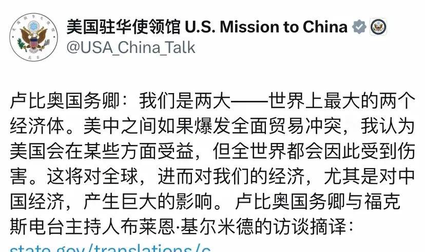 什么都不用讲,就问:既然爆发贸易战“美国会在某些方面收益”,而“对中国经济,产生巨大的影响”,美国为什么不打?等什么? 所以,这充其量就算是鲁比奥新发明的一种恐吓吧,这种恐吓有两个作用,一是把美国打扮的像一个善人,也为自己的不敢找借口;另一个作用就是老生常谈地对中国进行威胁。