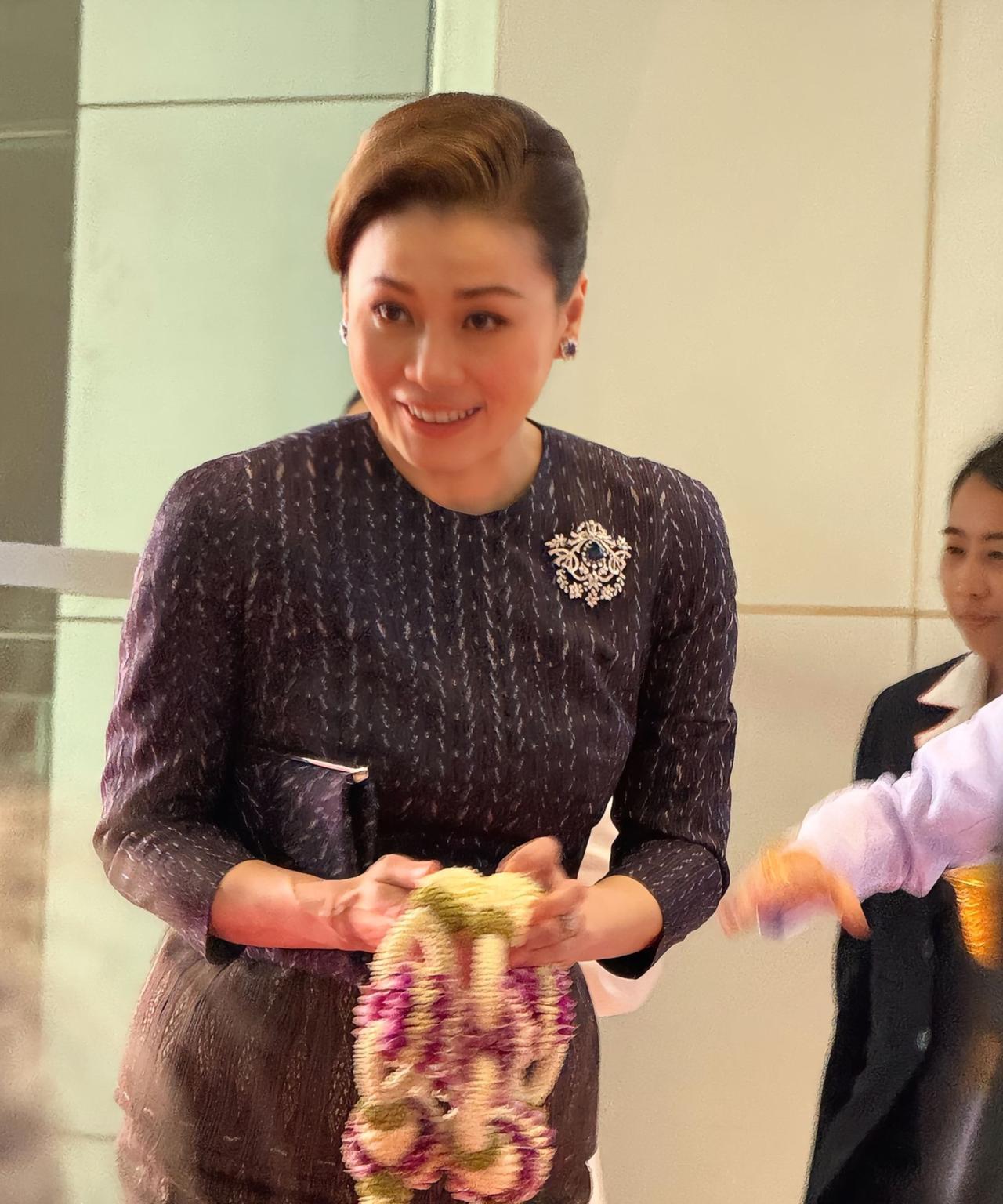 苏提达王后眉眼舒展,脸上没有一丝皱纹 苏提达近日出席例行公务时,一袭深紫色连衣裙