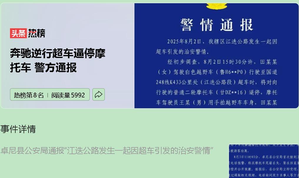 这起甘南公路的路怒闹剧,简直就是现实版的“人在囧途”——本来是看风景的,结果自己成了社会新闻的反面教材。 田某那波超车操作,简直像在演赛车片,直接把摩托车逼停在对向车道,国道上车多路窄,这动作不是玩命是什么?王某被逼停后拍车泄愤,虽说情有可原,但这种动手方式,分明是在给矛盾拱火。更离谱的是田某下车就踹摩托车尾箱,这哪是路怒,分明是把马路当擂台,直接升级为财物损坏了。 最让人无语的是后续操作。王某隔了一天才报警说尾箱丢了,现场没拍照没固定证据,双方各执一词,活生生把警察叔叔逼成“跨省追凶”的节奏。调解现场更是像看一出闹剧,双方死磕到底,非要把小摩擦演成伦理大戏,警力就这么被当冤大头使? 这类路怒纠纷,说到底都是情绪管理的翻车现场。超车别玩命,被别了也别动手,行车记录仪拍下来直接报警,既安全又省事。东西真被损坏当场报警拍照,隔天说嘴都硬了,吃亏的还是自己。警察调解给台阶,真没必要非争个输赢,最后两败俱伤还浪费公共资源。 甘南那条江迭公路,旺季堵得跟停车场似的,风景再美也经不起路怒糟蹋。提前规划行程,多留点时间,有时候踩刹车比踩油门更重要。这俩人闹得那么欢,最后跨省追查的结果会怎样?估计连他们自己都没想到,这场公路纠纷会成为社交网络的“年度迷惑行为大赏”吧。#奔驰逆行超车逼停摩托车 警方通报#