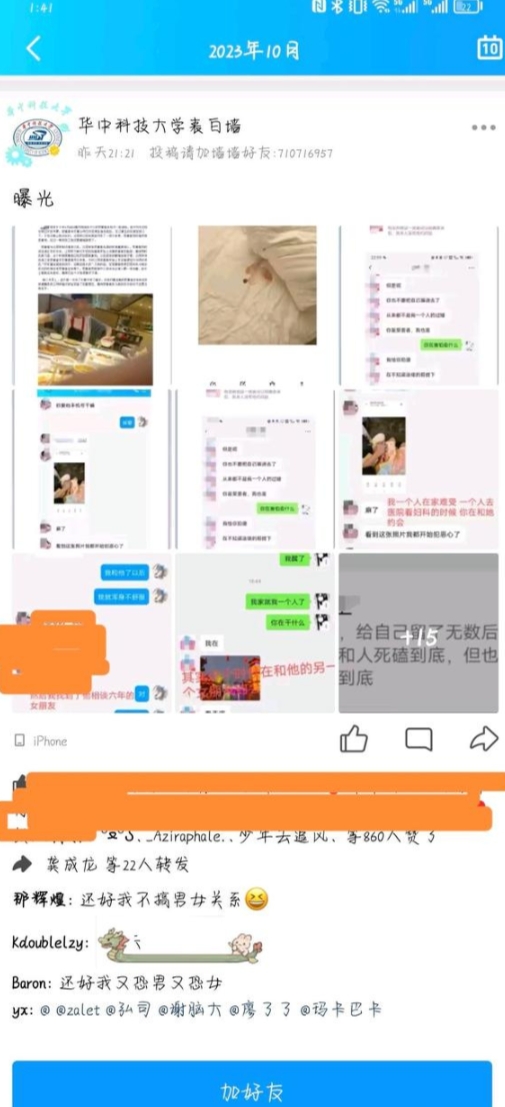 有网友在华中科技大学贴吧发帖,说跟武汉大学诬陷性骚扰事件引爆全网只差4天,他同样遇到了被人诬陷的事情。2023年10月9日,楼主本人被人造谣xq女生。好在华中科技大学领导们有担当,负责任,查明情况后,在谣言彻底爆发前,就带着楼主报警,并教他如何应对网络暴力,进行心理疏导。学校还主动动员力量应对舆情,把造谣的影响降到了最低。最后,造谣者甚至被处以行政处罚。