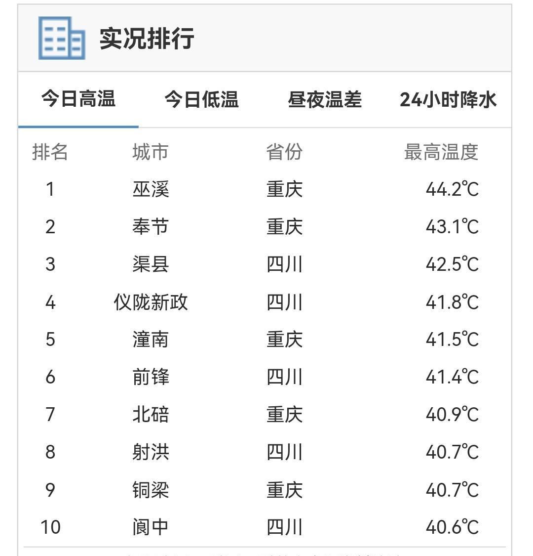 川渝不愧是一家人, 热都热的这么整齐! 8月4日全国最热的十个地方, 5个在四川,5个在重庆, 川渝就是铁哥们,这个分不开的,热起来都是那么的相随! 在各种网络上来看,感觉四川和重庆网友,似乎有那么一点的不对付。尤其是看综艺节目,有的明星说喜欢吃成都小面,然后对面立刻说那是重庆小面,然后表情就特别愤怒的样子。不是成都小面和成都小面,不都是面吗?有什么区别?何必真的这么急赤白脸的? 可能成都和重庆这两座城市,作为川渝双子星,距离又不远,谁也不服谁,有点像南京和苏州的意思,而且成都和重庆的重要性都很大。重庆是抗战时期的陪都。而成都也是西南地区,最重要的军事重镇,也是蜀汉多年以来的首都和重镇。 所以历史底蕴是成都更重,现在来看,重庆又更受重视,所以从资源争夺来看,双方就比较难以调和。而且现在国家的大战略,是开发大西南,将重要企业转移到四川和重庆这样的大后方,还有更多的安全考虑。 但是在转移的过程中,到底是去谁家,那又是一番争夺,自然就慢慢的积累出来一些矛盾。反正是在外人看是这样的,就像我们山东的青岛和济南,也是互相瞧不上,各种矛盾不断,这可能也是发展中的必然。 只不过一直和气生财的话,未必也是一种好事,但是川渝真的热,40度以上的天气一直持续一两个月,换谁也撑不住。博主在山东,每天都30度左右,就已经热得受不了,天天40度以上,这简直太难熬了。