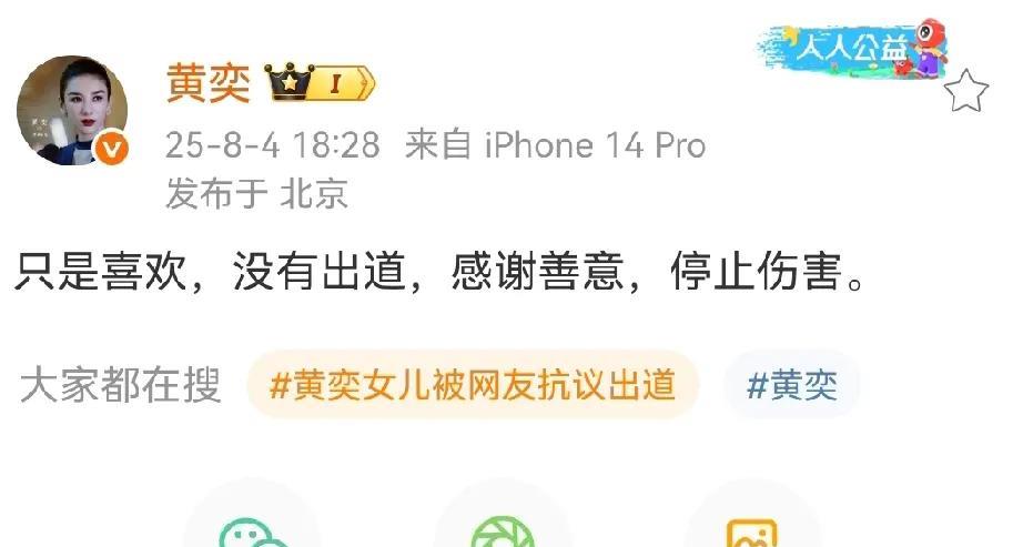 只因为网友们看到黄奕送女儿去韩国体验练习生的行为后,觉得黄奕这是在试探大众对她女儿出道的感观,看到网友们都反对后,才发文说是体验,没有出道。 作为一个罪犯的女儿有什么资格出道? 黄奕之所以能不受影响,是因为她在黄毅清被抓之前就和黄毅清离婚了,还被黄毅清家暴恐吓,事业因此停滞不前,网友们心疼她,觉得她也是受害者,但黄芊玲作为黄毅清的女儿,是黄毅清犯罪受益者,这样的人考公都不行,凭什么进娱乐圈当明星? 黄奕这次有种搬起石头砸自己脚的感觉,明明之前她带女儿出镜,网友们都没什么抵触的情绪,但是这次黄芊玲想出道当明星,她还支持,这就惹众怒了,导致她的口碑和路人缘都受到了影响,实在是不值当啊!#头号创作者激励计划#