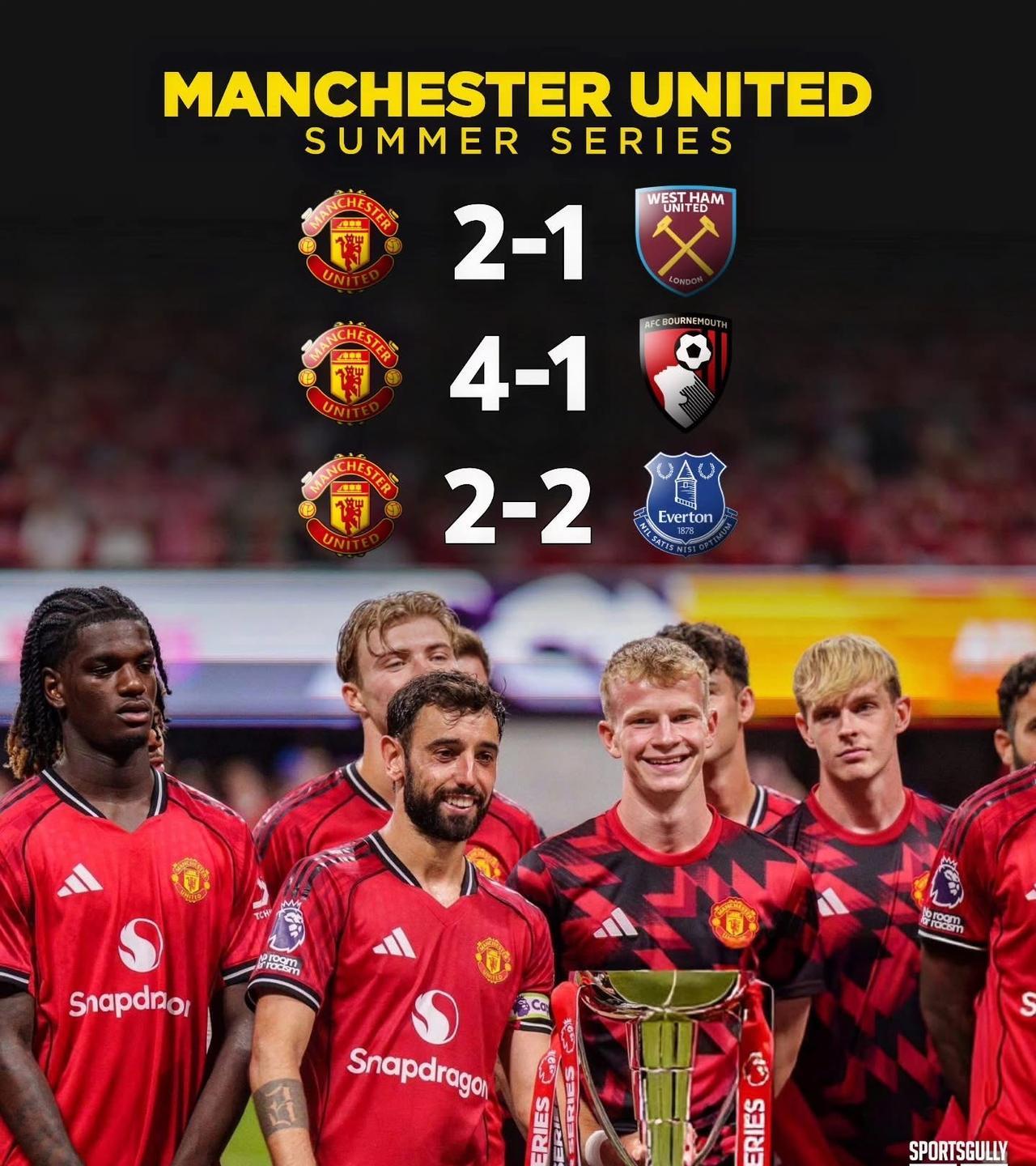 曼联2比2战平埃弗顿。 一场英超强度级别的季前赛,曼联还需要一名中场,最适合B费的位置依然是前腰,让他拖后的话,中场就会整个失衡。 虽然平局,但曼联也成功赢得了英超夏季系列巡回赛的冠军,也算是好的开始!