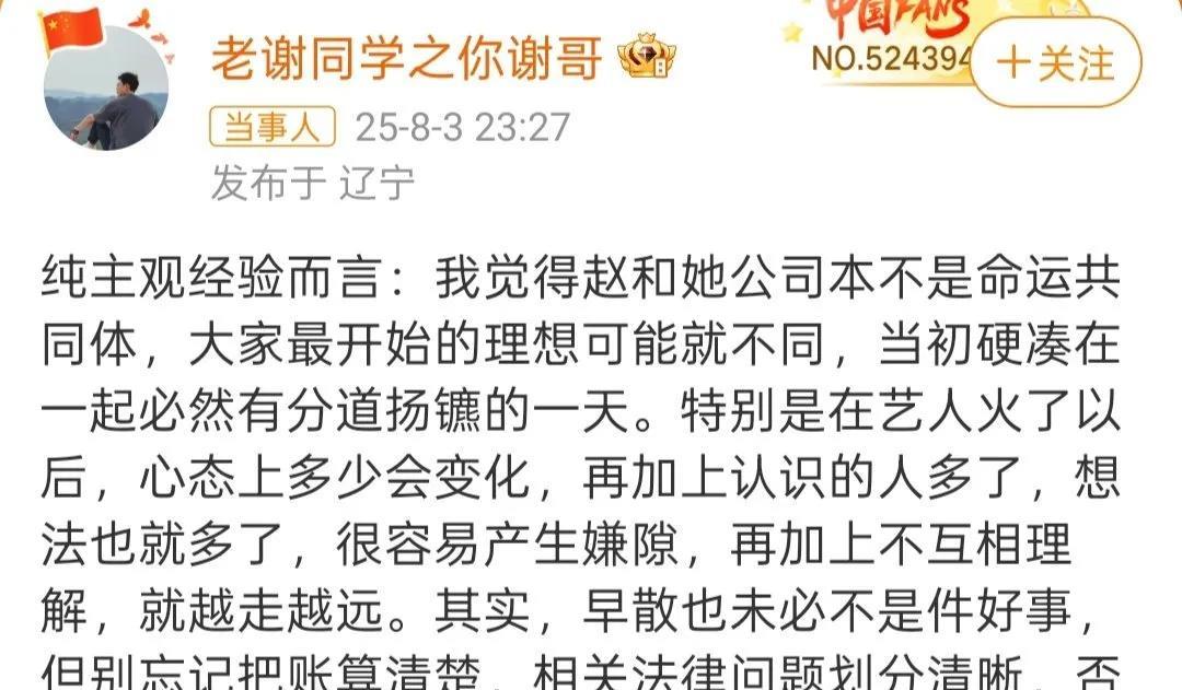 在娱乐圈艺人和公司的共生关系里,“命运共同体”从来不是单方面的捆绑,而是建立在彼此尊重、共同成长的基础上。就像IU李知恩与她的公司,多年来始终保持着良性互动——公司给予她充分的创作自由,从音乐风格到转型尝试都全力支持,而IU也用持续的热度与作品反哺团队,这种相互成就的模式,早已成为行业里“共生共赢”的范本。 反观当下一些争议,比如关于赵露思与公司关系的讨论,不少人感慨“并非艺人火了就心态变,而是压迫式合作耗尽了信任”。如果公司只把艺人当作流量机器,一味用密集的行程、同质化的资源进行“压榨”,忽视其对角色突破的渴望、对休息调整的需求,那么所谓的“一条心”便成了空中楼阁。赵露思从甜宠剧女主到尝试更多元化的角色,观众能看到她对职业的敬畏与野心,可若背后始终是“被推着走”的被动状态,当创作热情被琐碎消耗,当个人诉求被反复搁置,即便是再温顺的合作者,也难免会生出“没招了”的无力感。 其实,艺人与公司的关系就像航船与水手,公司是掌舵的方向,艺人是破浪的动力,唯有双方都在意“船能否行得更远”,而非只盯着眼前的风浪,才能真正形成“命运共同体”。IU的案例之所以被称道,恰恰是因为公司懂得“留白”——给艺人成长的空间,也给自己沉淀的时间;而那些只懂“收割”的合作,终究会在消耗中失去彼此的支撑。毕竟,娱乐圈最珍贵的从来不是一时的热度,而是能一起走得长远的默契与诚意。