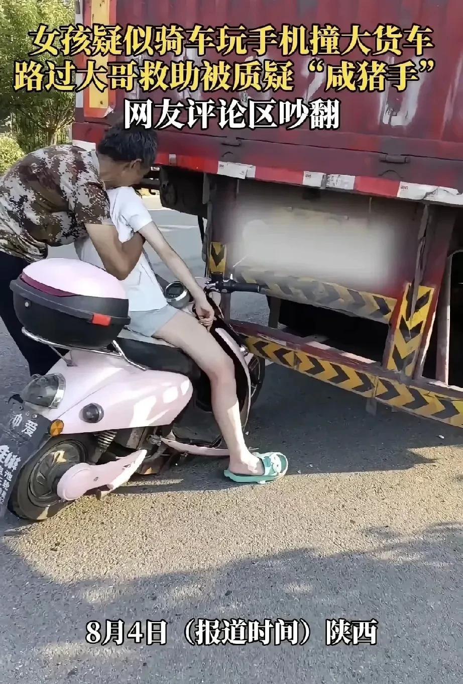 女子追尾大货车,一大爷赶忙上前扶住并施救,这本是一件值得赞扬的事,可大爷却因施救时手放置的位置不妥引发网友热议。 人都快不行了,还计较什么猪手鸭手的。我想说,但凡那些说猪手的人在现场,你不一定敢上去帮忙。人心善的话,看什么都是美好的;人心恶的话,看什么都是丑恶的。明明是在救人,怎么心思能那么龌龊呢?心肺复苏被说成猪手,人工呼吸被说成是占便宜,这难道就是那些心思恶毒之人说的话? 女子能追尾撞上大车的电动车,无非两种原因:要么在看手机或者走神发呆入迷了;要么骑得太快,大车急刹而电动车刹不住。我每天都会看到很多骑车玩手机的人,我特别好奇到底是什么内容把他们吸引住了。
