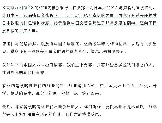《南京照相馆》这部电影已经上映11天了,票房突破了16亿元人民币,成为暑期档最大的黑马,针对这部电影的讨论和评论是很多的,也有不少网络大V写文章讨论自己的看法,其中我认为卢克文的文章写的是非常好的,我从小就听到一种声音,反复的在说日本人民也是战争的受害者,发动侵华战争的是日本军国主义份子,同日本人民无关,现在长大后了解了更多历史后,才知道日本在二战狂热的对外侵略扩张,日本人民表现的是非常积极与支持的,日本人民是战争的始作俑者并不是受害者,原子弹下无冤魂是有道理的,那些让中国人反思的人可以闭嘴了,真正要反思的是日本,卢克文在结尾时所讲的,只有在清算后所有的血债,我们才能有资格慢慢反思,清算都没有,我们有什么资格谈反思呢?抗日英烈的血不能白流,我们后人没有必要也没有资格替他们原谅日本当年做的孽!