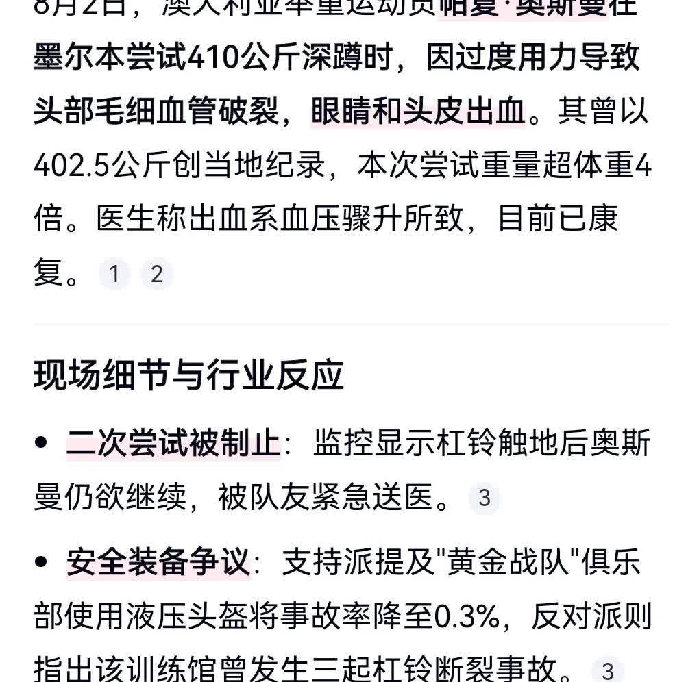 真是太吓人了。 举重一定要量力而行。 8月2日澳大利亚,一名举重运动员深蹲时非常吃力,用力过猛,他当时正在深蹲410公斤,这真的是太不可思议了。这么重。 结果他用力过猛,导致连头皮都出血了。 后面的安全员看到情况不对,立马抱住了他。 后来送到医院康复。