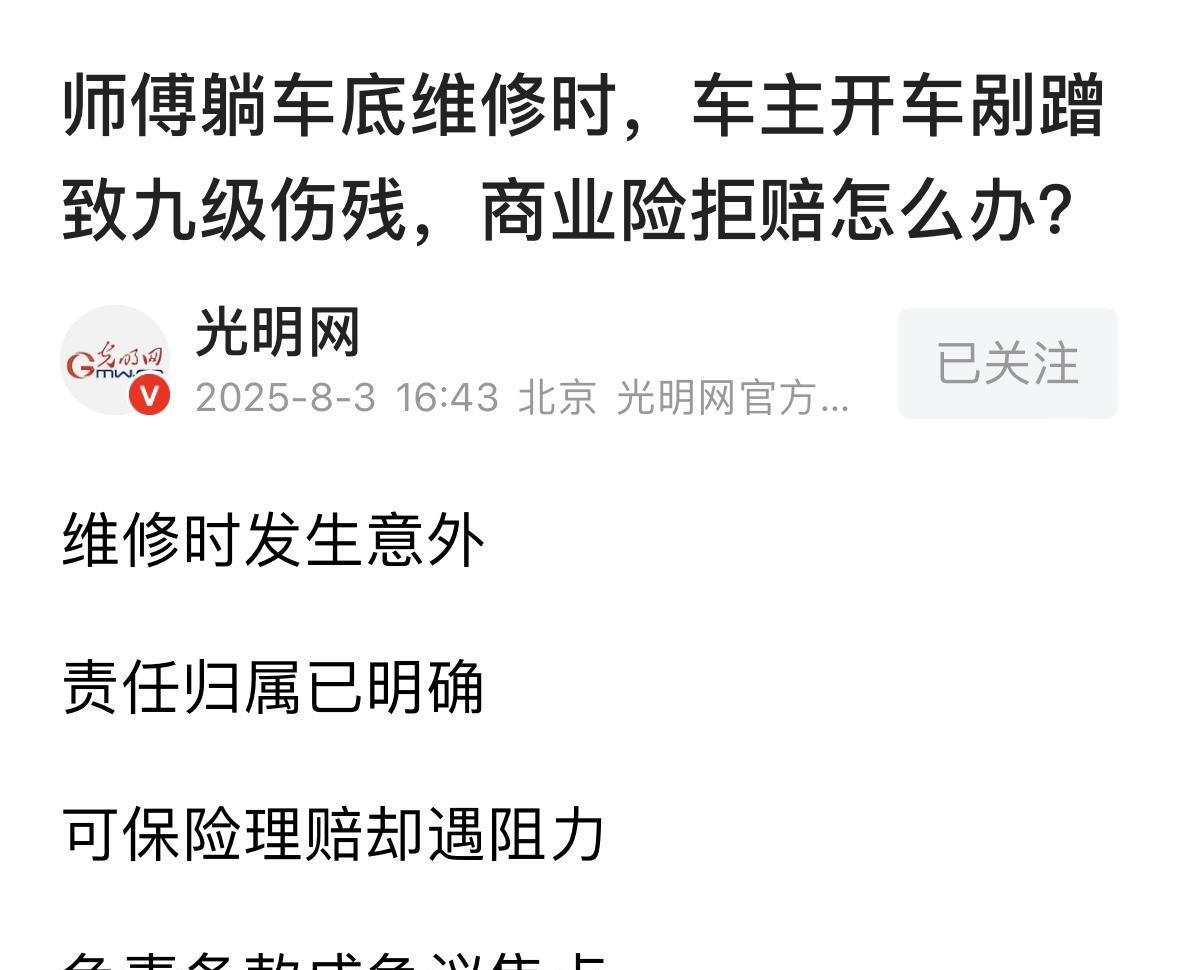 湖南岳阳,货车司机遇刹车故障,就停车叫了个师傅来修,师傅在车底检修时,司机父亲让他下车看看,没成想,司机误听成驾车起步,他当即启动车辆,造成车底的师傅多处骨折、九级伤残,治疗花了27095元,保 险公司赔了交强险的18000元医疗费,但以师傅在营业性场所维修为由,拒赔商业险。师傅索赔无果,只好把司机和保 险公司告上法庭,法院这样判了。 8月3号,光明网报道,廖师傅在国道边开了十年修车店。 2024年1月的一天,货车司机曾某驾驶重型货车途经国道时,发现刹车系统故障。 他把车停在路边,拨通了常年在附近修车的廖师傅电话。廖师傅赶到后,钻进车底开始检修。 这时,曾某的父亲让儿子“下车看看”。 哪成想,曾某竟误听成“启动车辆”,他一脚油门下去,直接造成师傅骨折。 交警出具的《道路交通事故认定书》显示,曾某因操作不当负全责,廖师傅无责任。 这场事故导致廖师傅导致三处椎体骨折、横突骨折,他住院治疗了47天,医疗费花了27095元,经鉴定落下九级伤残,后续康复费用更是无底洞。 让廖师傅更糟心的是赔偿问题。 涉事货车投保了交强险和商业险,事故发生在保险期内。保险公司很快赔付了交强险的18000元医疗费,但拒绝赔付商业险。 理由是保险合同中有一条免责条款:在营业性场所维修、保养、改装期间发生的事故,保险公司不赔。 廖师傅并不认可,说我这车明明是停在国道边修的,怎么算营业场所? 他拿着保险合同找律师咨询时,发现条款里的“营业性场所”并未明确界定。 而保险公司坚持认为,只要车辆处于维修状态,无论在哪里发生事故都适用免责条款。 货车司机曾某则觉得自己买了全险,赔偿责任该由保险公司承担。 这场纠纷最终闹上法庭。 那么,从法律角度,法院将会怎么判呢? 《保险法》第17条规定:订立保险合同,采用保险人提供的格式条款的,保险人向投保人提供的投保单应当附格式条款,保险人应当向投保人说明合同的内容。对保险合同中免除保险人责任的条款,保险人在订立合同时应当在投保单、保险单或者其他保险凭证上作出足以引起投保人注意的提示,并对该条款的内容以书面或者口头形式向投保人作出明确说明;未作提示或者明确说明的,该条款不产生效力。 保险公司以"在营业性场所维修、保养、改装期间"的免责条款为由拒绝赔付商业险,但法院未采纳其抗辩理由,核心争议点在于保险公司是否履行了法定的提示与说明义务。 保险合同中"营业性场所"的表述未明确界定范围,如是否包含公共道路,属于格式条款中的模糊表述。 根据《保险法》第17条,保险公司需对免责条款的具体含义进行明确说明,否则投保人可能产生误解。 廖某某作为修车工,文化程度有限,对保险术语的理解能力较弱。保险公司未提供证据证明其已通过书面或口头形式向投保人解释"营业性场所"的具体范围,也未在保险凭证上以显著方式提示该条款。 因此,该免责条款在本案中不产生法律效力。 《民法典》第1213条规定:机动车发生交通事故造成损害,属于该机动车一方责任的,先由承保机动车强制保险的保险人在强制保险责任限额范围内予以赔偿;不足部分,由承保机动车商业保险的保险人按照保险合同的约定予以赔偿;仍然不足或者没有投保机动车商业保险的,由侵权人赔偿。 法院认为,保险公司已在交强险范围内赔付18000元医疗费,符合"强制保险责任限额范围内优先赔偿"的法定顺序。 在交强险赔付不足后,法院认定涉事货车投保的商业第三者责任险应覆盖剩余损失。保险公司虽主张免责,但因免责条款无效,其仍需在商业险范围内承担赔偿责任。 法院审理时,重点厘清了三个关键问题,第一个就是事故是否发生在“营业性场所”? 法院认为,涉事货车是临时停靠国道边维修,事故也发生在公共道路上,不符合保险合同约定的“营业性场所”情形。保险公司将公共道路等同于营业场所,属于扩大解释条款。 那么,车辆是否处于“维修期间”? 按照通常理解,车辆维修期间应指维修人员控制车辆进行操作的时间段。而本案中,事故发生时廖师傅正在车底检修,车辆实际由曾某控制,不属于维修操作持续阶段。 最后法院指出,本次事故是曾某误听指令启动车辆导致,与车辆本身的刹车故障无必然因果关系。保险公司不能以“维修期间”为由免责。 基于上述认定,法院判决保险公司需在交强险和商业第三者责任险范围内赔偿廖师傅319407元,扣除已支付的18000元和非医保费用1364元后,实际应赔付300043元。 剩余1364元由曾某个人承担。 保险公司不服判决提起上诉,中级人民法院二审维持原判。 对于这件事,你怎么看? 欢迎关注@猫眼学法 #头号创作者激励计划#