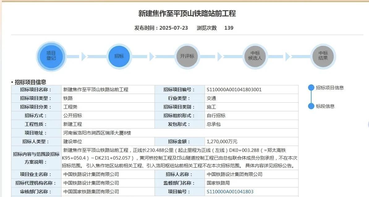 焦洛平高铁全面开工了,上次开工的是焦洛平控制性工程,这次招标的是焦洛平高铁站前工
