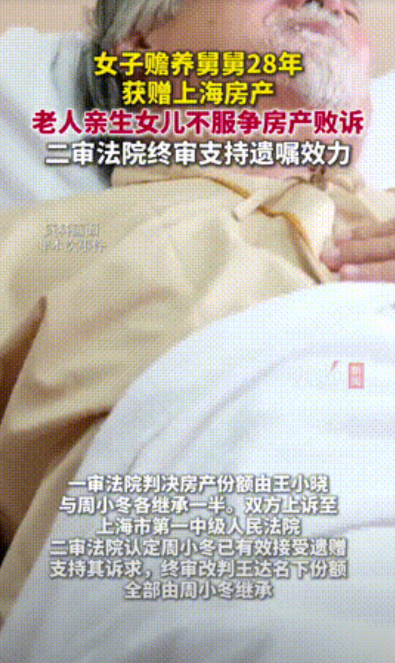 “脸都不要了!”上海,一男子与女儿感情不和,晚年无人照顾,外甥女可怜舅舅,于是就把男子带在身边照顾了28年。男子为感谢外甥女的付出,将自己名下的房产全留给了她,亲生女儿得知后坚持反对,双方闹得不可开交,最后闹上了法院,法院判了! 上海的九旬老人王大爷(化名)一直和自己的外甥女周女士(化名)住在浦东新区的一套房子内。 王大爷早年丧偶,自己一个人含辛茹苦的将女儿拉扯大,之后还帮着女儿带外孙女。 这套位于浦东新区的房子是他自己在2001年买下来的,因为自己跟孙女很亲,老人在办理房产登记的时候捎带上了外孙女小高(化名),二人各占房产的50%。 但王大爷和女儿王某(化名)在多年之前闹了个很大的矛盾,父女二人恶语相向,王某更是扬言和王大爷断绝关系。 此后的近30年时间里,王某竟然真的很少去看望王大爷,至于王大爷的身体情况那更是不闻不问。 王大爷的外甥女周女士看舅舅晚年如此凄惨,她实在是于心不忍,于是她辞去了原本的工作赶到上海,从此开始照顾王大爷。 周女士整整照顾了王大爷二十八年,她为王大爷买菜做饭、洗衣打扫、端茶递水、陪着看病。 2009年,王大爷当时生了一场大病,他觉得自己时日无多了,于是就立下了公证遗嘱。 看着外甥女这十多年来对自己不离不弃的照顾,再看看亲生女儿的疏远,他决定在自己百年之后,将名下的房产份额全部交给周女士一人继承。 没想到大病一场后,老爷子的身体反而一天比一天硬朗,直到2020年的时候,已经年过九旬的王大爷在一天夜里安详的走了。 王大爷去世后,周女士第一时间让丈夫告知了王大爷的女儿王某,并将当初公证遗嘱的照片发给了小高,让她配合自己办理房产过户手续。 没想到二十多年来对父亲不管不顾的王某,如今涉及到遗产继承却又蹦了出来。 她以没有证据证明存在所谓的遗嘱,也无法证明周女士在王大爷去世后六十日内作出了接受遗赠的意思表示,要求按照法定继承程序分配遗产。 周女士却表示,遗嘱早在王大爷去世两周内她就已经发给小高了,而且附近的邻居都可以证明遗嘱的真实性。 根据《民法典》第1124条的规定,受遗赠人应当在知道受遗赠后60日内,作出接受或者放弃受遗赠的表示;到期没有表示的,视为放弃受遗赠。 由于周女士没能拿出足够的证据,证明自己是在王大爷去世后的60天内作出了接受遗赠的表示,应视为周小冬放弃接受遗赠。 但是考虑到周女士伺候了老爷子那么多年,功劳苦劳都有,所以还是决定从老人的遗产里“适当”分一点给她。 最后法院判决,王大爷50%房子份额,亲闺女王某和外甥女周女士一人一半(各25%)。 对于这一结果,双方都表示不服,向法院提起了二审上诉。 二审中,周女士拿出了自己曾在老人去世一月后通知小高的通话记录,并且证明了在老人去世的60天内,周女士曾与王某等人有交接过物品,但因为继承纠纷,小高并未拿出房产证协助办理房产继承事宜。 二审法院审理后认为,周女士的行为符合接受遗赠,最终法院撤回了一审判决,王大爷名下50%的房产份额由周女士全部继承。 对此,大家又是如何看待的呢?