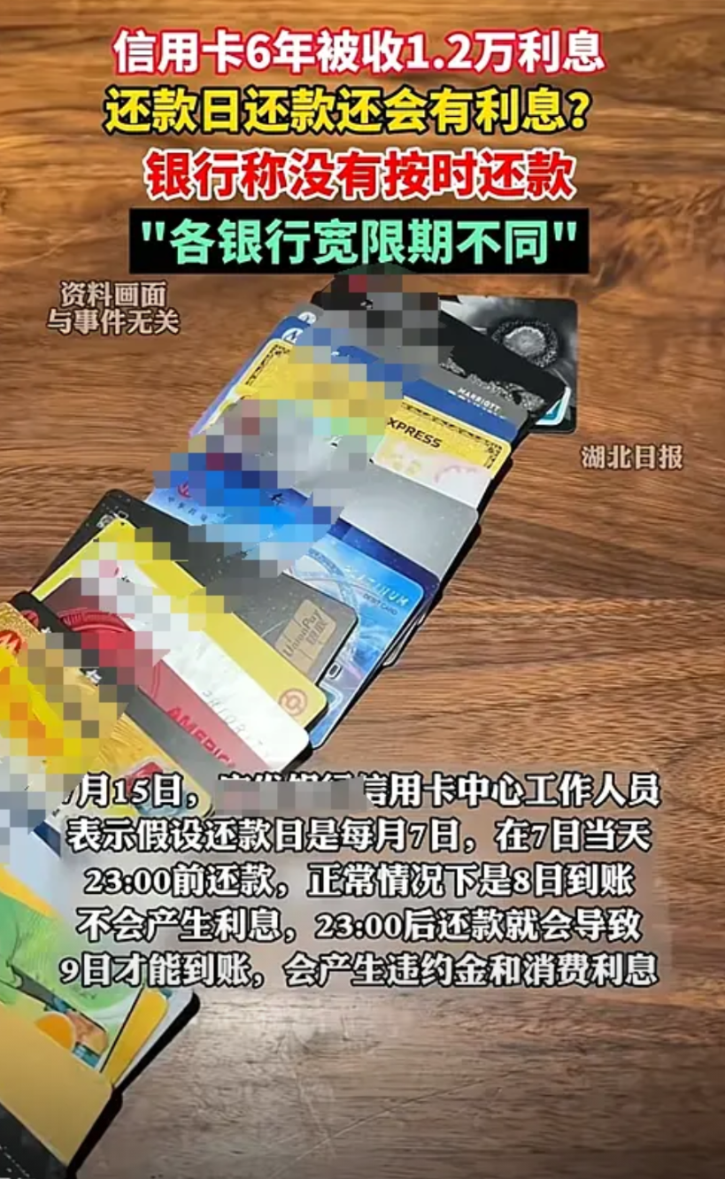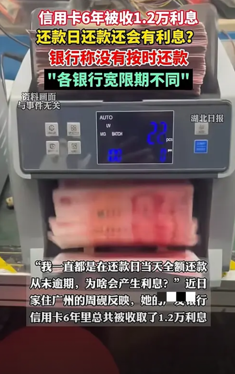 火到人民日报了!广州,一女子的信用卡,每月都按时还款,万没想到,6年后,女子竟发现,银行6年时间扣走她1.2万余元利息,女子这才知道,还款旁边有句“今日还款次日到账”的小字,让她每月都超时,还支付了几年的违约金,女子怒了!