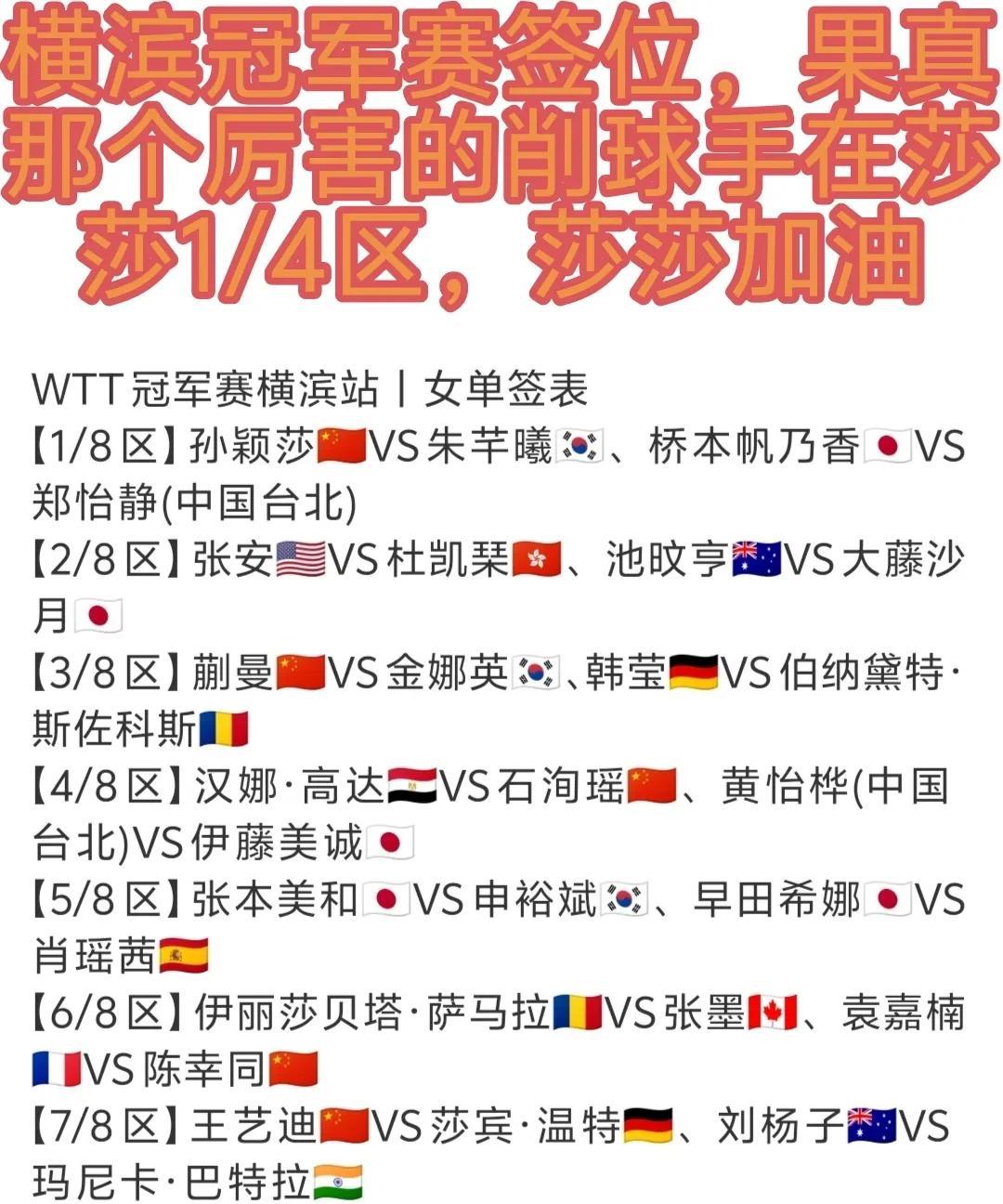 横滨冠军赛签位出炉,五大看点! 一,林昀儒第一轮遇林诗栋,洛杉矶周期台林已经输了小石头四次 二,张本智和又一次落入林诗栋半区,同样林诗栋连续三次输张本,不知道这次有没有突破! 三,王楚钦首轮内战陈垣宇,内战不好打,希望楚钦不要掉以轻心! 四,世界最强削球手日本选手桥本帆乃香在孙颖莎1/4区!相信最会打削球的孙颖莎会给我们带来很精彩的攻削大战! 五,张本美和在王曼昱半区,想必也很精彩! 国乒加油!