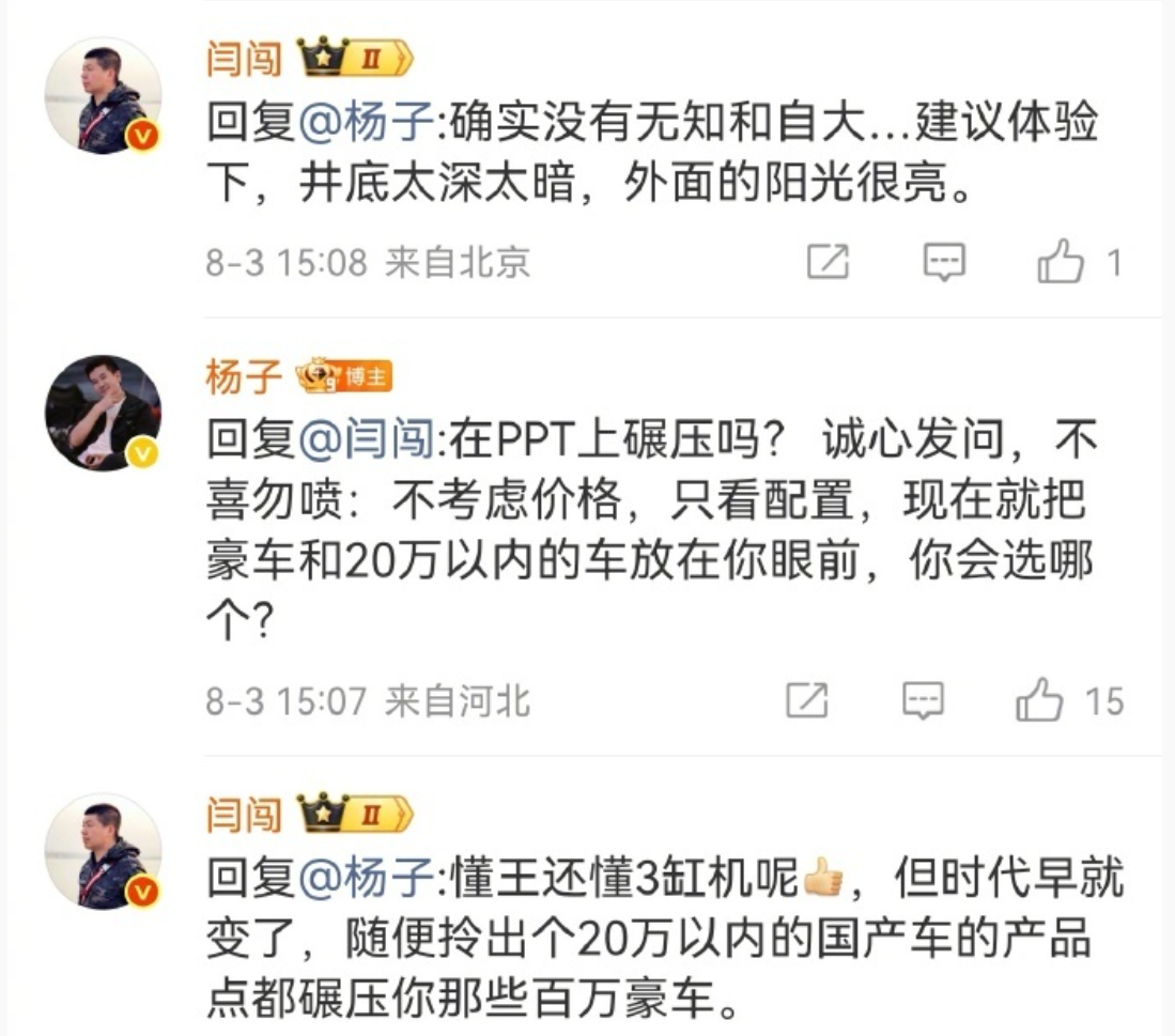 这件事的起因是,杨子昨日在微博晒了一张开大G的照片,闫闯现身评论区表达了“乘坐体验不如20万国产车”的观点。闫闯称:“随便拎出个20万以内的国产车的产品点,都碾压你那些百万豪车。